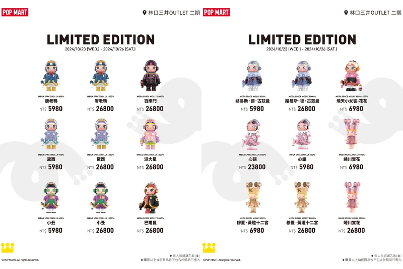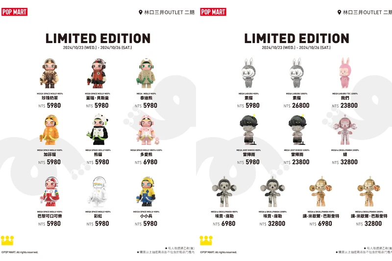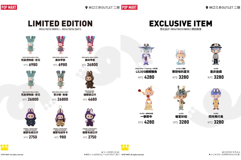 為了慶祝新門市開幕,POP MART在10/23當天開始販售多款門市限定商品,「LiLiOS 鯉鯉雕像」為LiLiOS設計師mspring與藝術單位「Silent Trick」及藝術家「虢子楷」三方聯名的珍稀作品,全球限量300支,售價4,280元;「LiLiOS 是非遊戲」同樣是全球限量300支,售價3,280元,手持O與X的指示牌,呈現若有所思又淘氣的呆萌感,另外還有6款LiLiOS系列限定商品開賣。