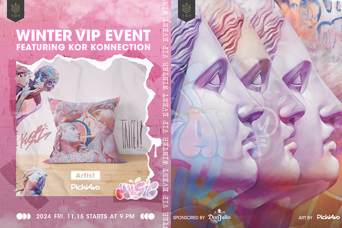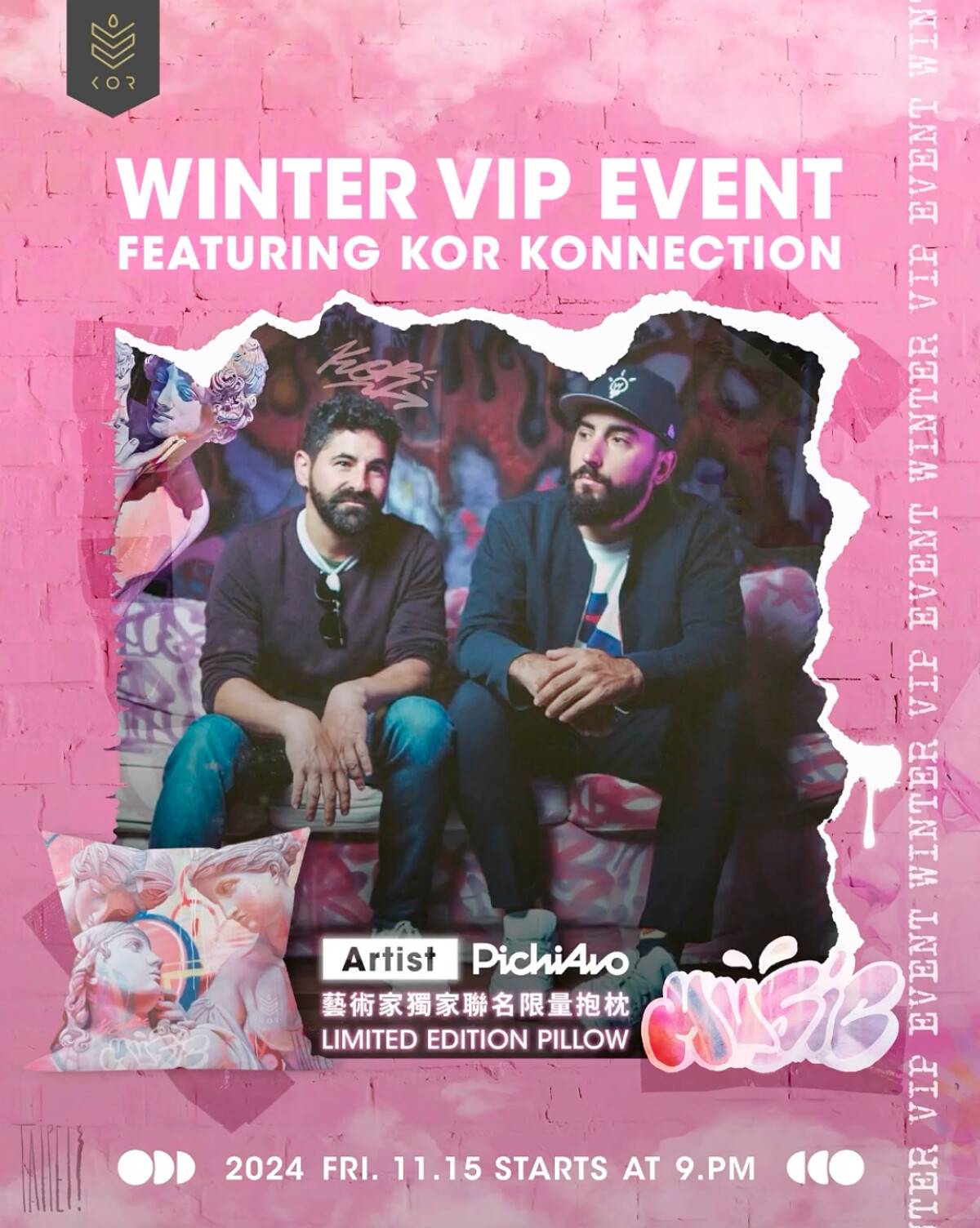 今年的 WINTER VIP Event,KOR 特別邀請來自西班牙的知名藝術雙人組 PichiAvo,將塗鴉與雕塑融入活動視覺設計,展現古典與街頭藝術的精緻平衡。這對來自瓦倫西亞的藝術家組合,自 2007 年成立以來,以大膽的城市藝術風格受到全球矚目。從紐約 Houston Bowery Wall 到波爾圖的全球第二大壁畫,他們的創作遍布世界,成為當代城市藝術的代表。今年活動現場,他們更為 KOR 打造聯名藝術抱枕,結合品牌精神與獨特創意,限量贈送,絕對值得收藏!