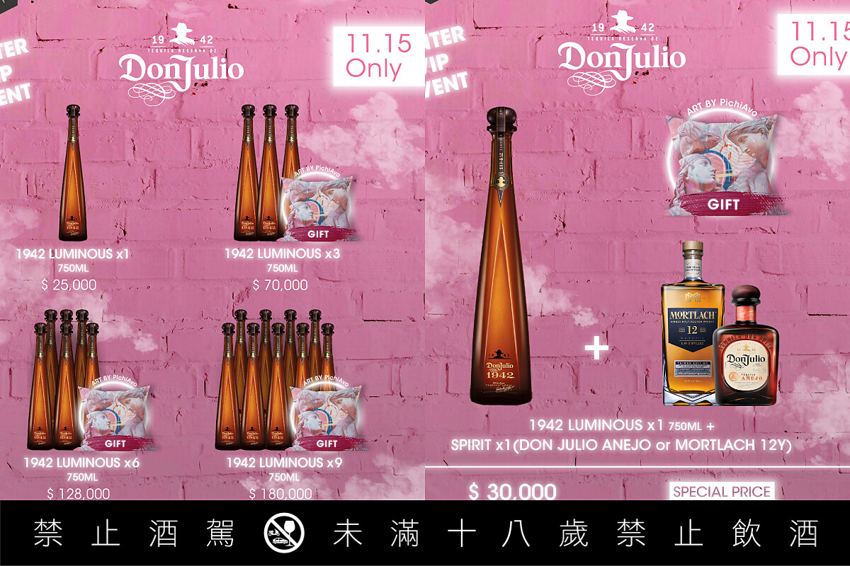 本次活動的官方贊助商 Don Julio 1942,是全球奢華龍舌蘭的頂級代表。採用小批量製程,酒液呈現琥珀金光,帶有濃郁香草與焦糖氣息,層次豐富且細膩。這款旗艦酒款不僅是國際名人和派對玩家的心頭好,更以其標誌性的修長瓶身成為派對場上的焦點。活動當晚,Don Julio 1942 將推出限定優惠套組,凡購買即可獲得 KOR x PichiAvo 聯名藝術抱枕,讓你在奢華享受中收藏藝術的獨特魅力!這場結合藝術、音樂與頂級酒飲的 VIP 盛會,絕對是今年年末最值得期待的時尚派對!
