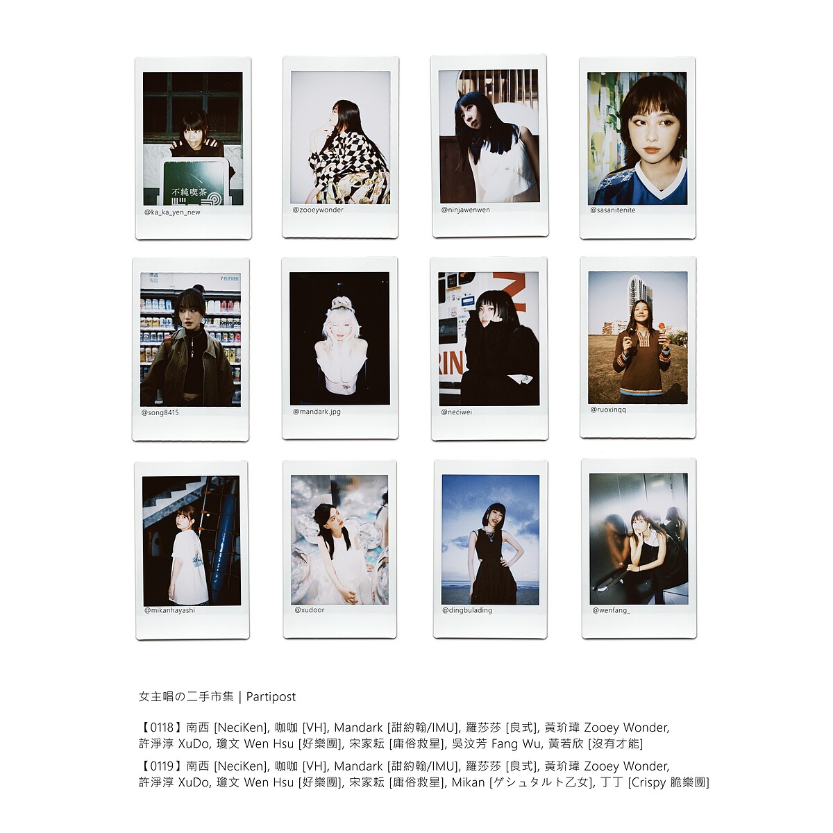 延續過去女主唱二手拍市集的熱度,今年冬日「香香的房間 — 女主唱の二手拍」即將再度回到熱鬧的中山區!2025「香香的房間 — 女主唱の二手拍」集結了十二位女主唱,南西(南西肯恩)、咖咖(Vast&Hazy)、Mandark(甜約翰、I Mean Us)、羅莎莎(良式)、黃玠瑋Zooey Wonder、許凈淳XuDo、瓊文(好樂團)、宋家耘(庸俗救星)、黃若欣(沒有才能)、吳汶芳Fang Wu、丁丁(Crispy 脆樂團)與 Mikan(ゲシュタルト乙女)都將帶來衣櫥裡的服飾與小物,歡迎粉絲來她們的「房間」挖寶,留下與女主唱們面對面交流的美好回憶!