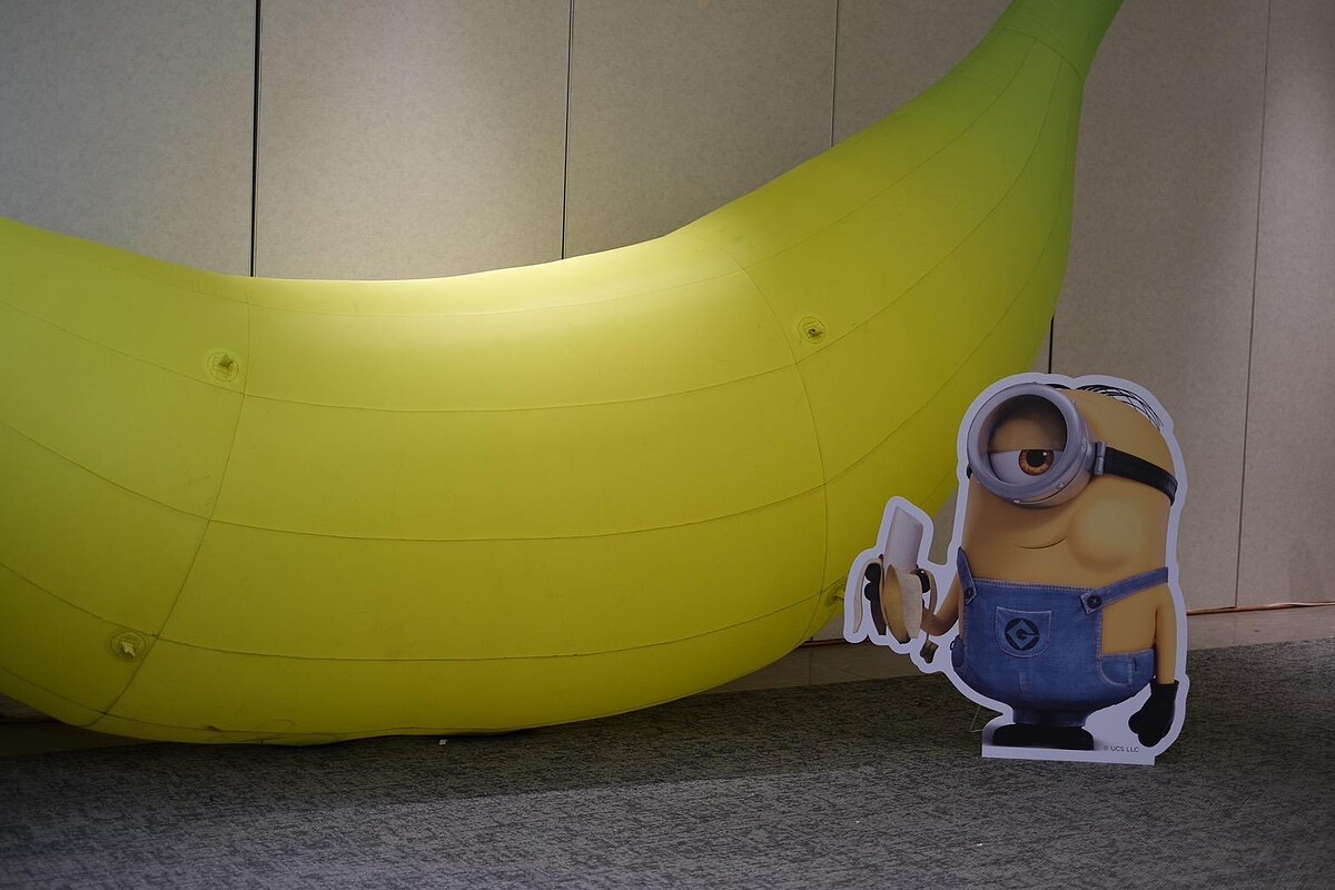 當然怎能少得了小小兵的靈魂伴侶——香蕉!現場更展出了一座5米長的巨型香蕉裝置藝術,象徵小小兵對香蕉的瘋狂熱愛。這座巨型香蕉不僅是一場視覺盛宴,更是拍照打卡的最佳地點,拍一張趣味滿分的照片,輕鬆集滿親朋好友的點讚。