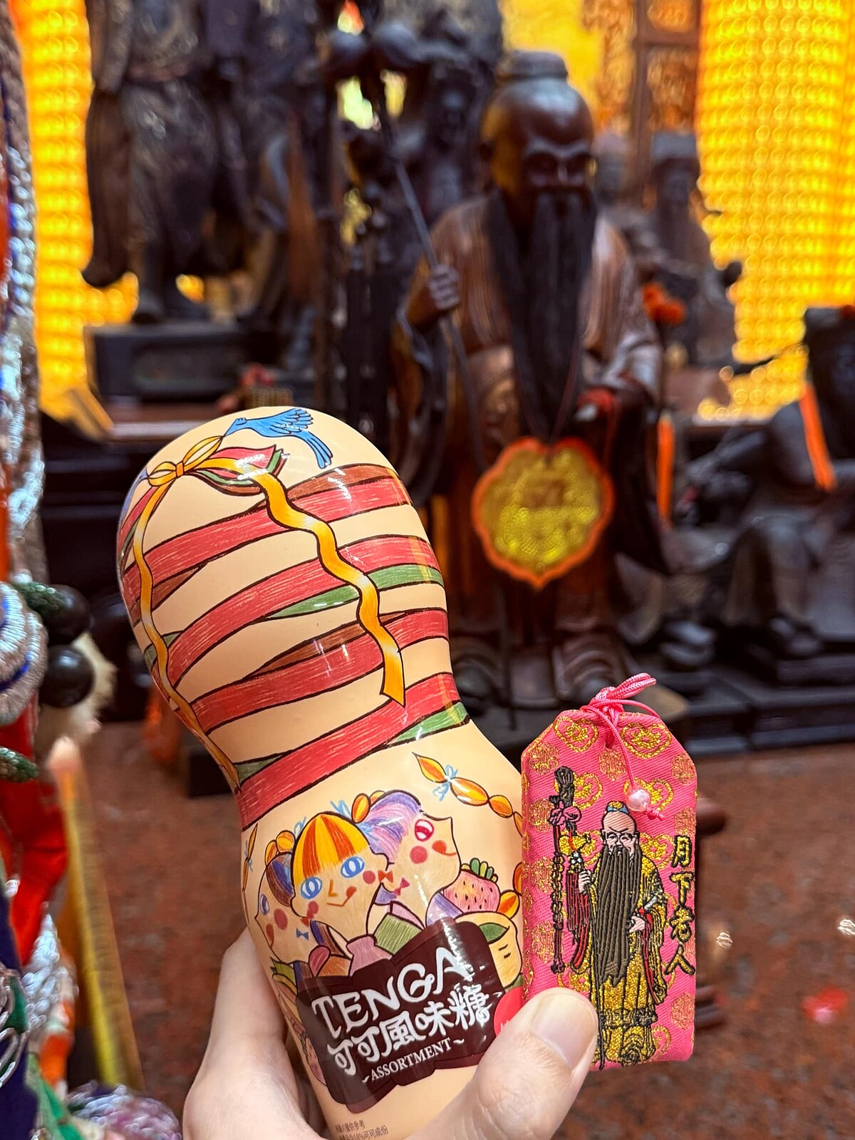 想要桃花滿滿的人,這次TENGA與台北霞海城隍廟推出的聯名禮盒必須收,「合十繫福 – TENGA x 霞海城隍廟聯名禮盒」中有三款「祈福過爐」保幸符(城隍爺、城隍夫人、月老),以及TENGA 熱銷可可風味糖與專屬籤詩,限量僅150份。