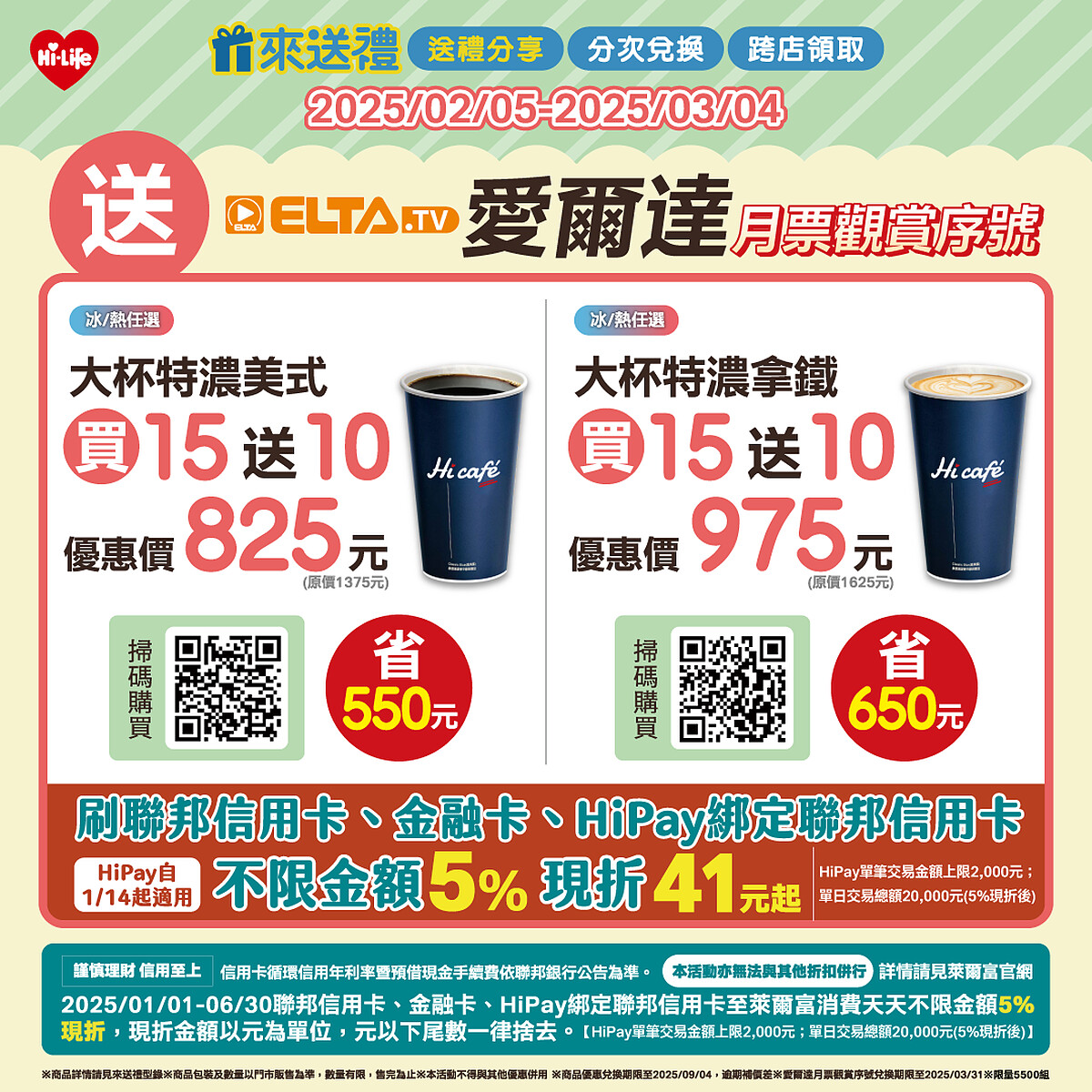 即日起至3/4於萊爾富門市購買「來送禮」平台指定咖啡組合,即可獲得「愛爾達月票觀賞序號乙組」(限量5,500組,送完為止),2/21至2/25限時推出指定商品優惠享最低4.4折起,另外,萊爾富官網將推出其他抽獎優惠!