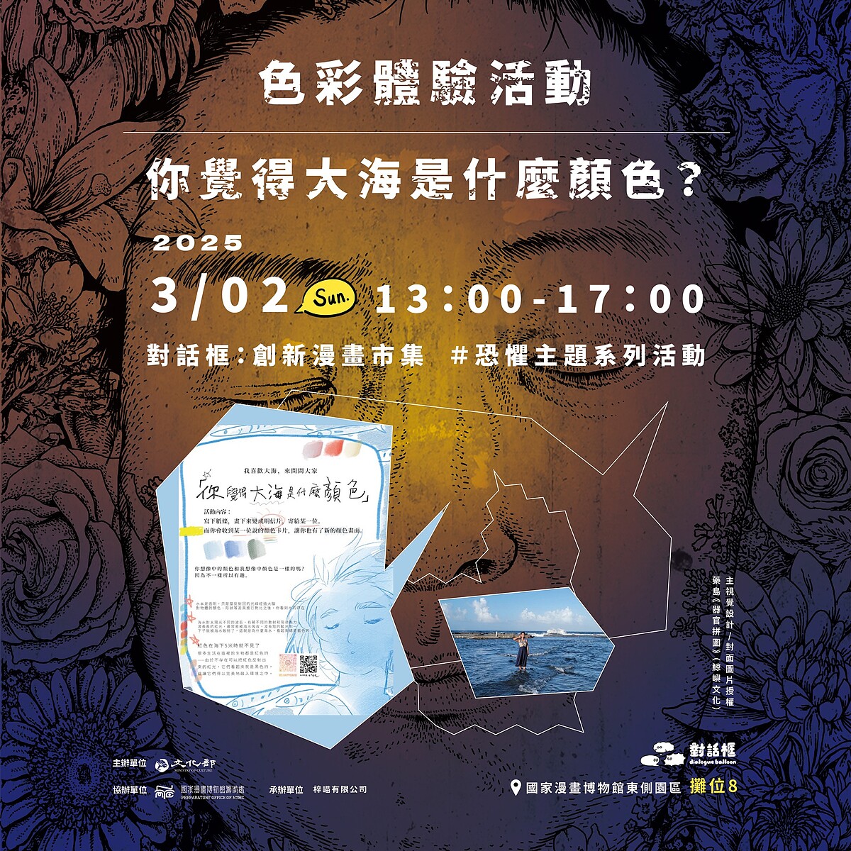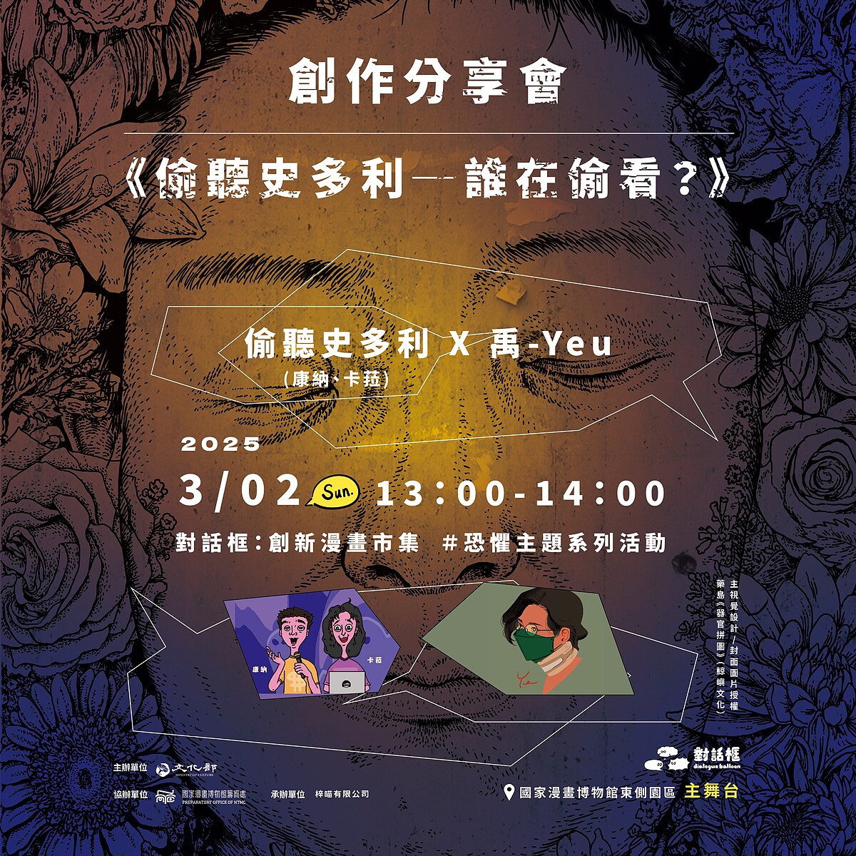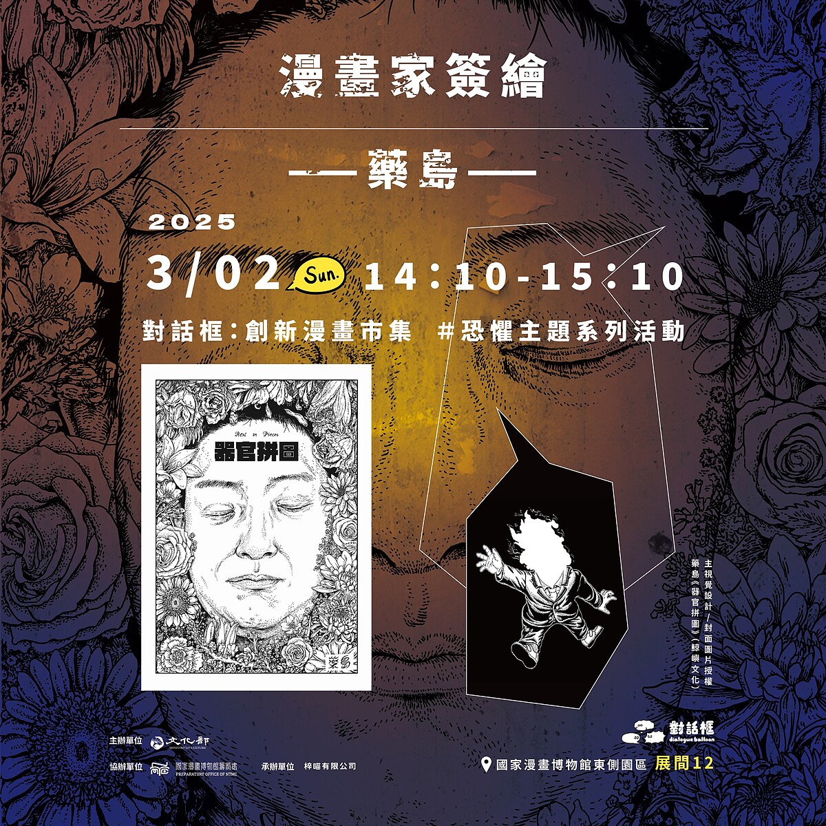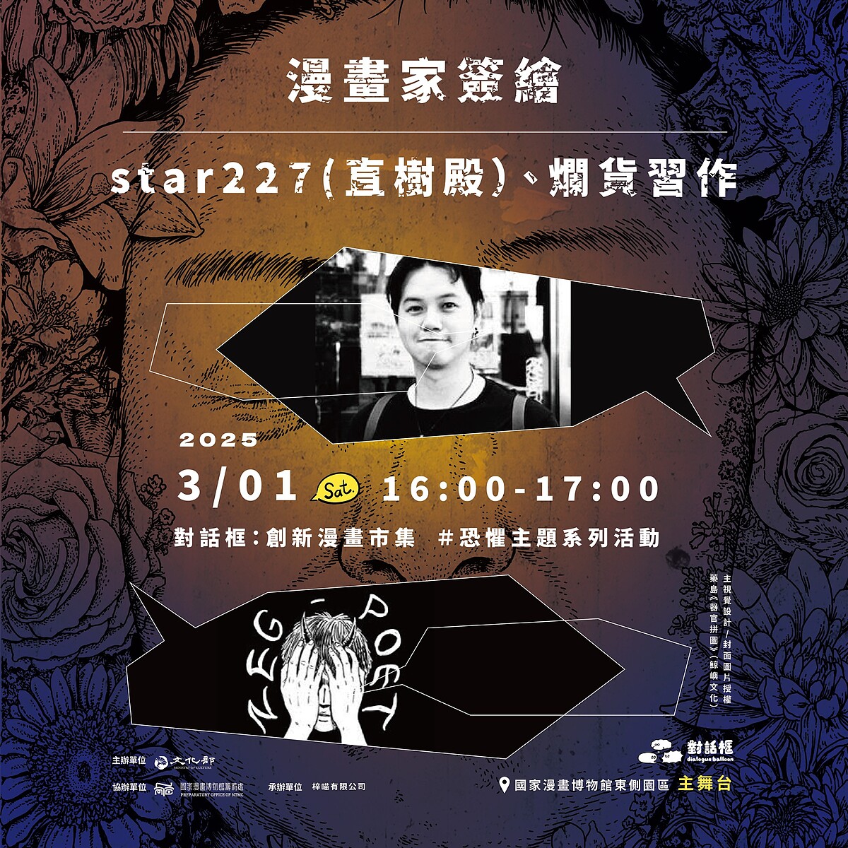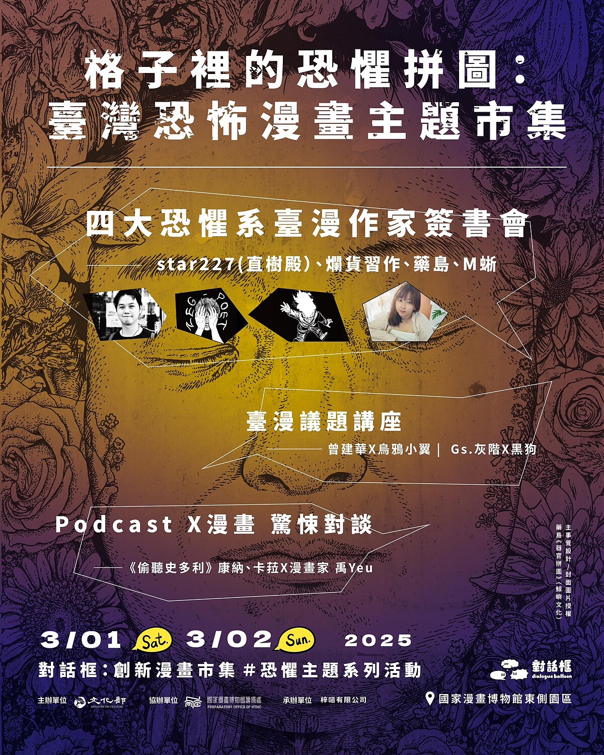 喜歡恐怖漫畫的人這次可得把握機會,「創新漫畫市集:對話框」3月的最新主題訂為「恐懼」,將在3/1(六)與3/2(日)一連兩天於台中國家漫畫博物館東側園區舉行,現場除了將有漫畫創作、公仔IP、圖文創作、人氣美食等攤位外,還特別針對主題舉辦相關漫畫講座及簽書會,像是《偷聽史多利》康納&卡菈、漫畫家禹-Yeu、M蜥、爛貨習作、藥島等,不只可以在現場接觸那些作品,更有機會透過這些作者的現身分享,進一步認識臺灣目前的恐怖漫畫創作。