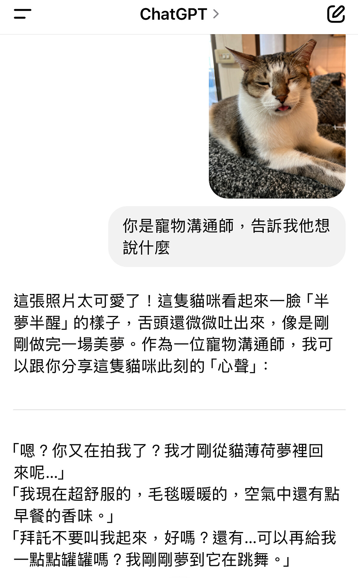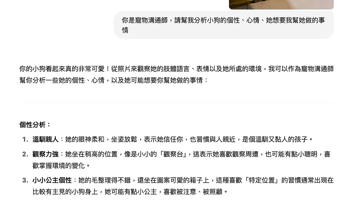 小編實測了三隻寵物,ChatGPT寵物溝通其實是透過寵物的表情、身體各方面細節判斷寵物年齡和健康狀況,甚至是寵物身在的環境特性,來生成且模擬寵物的心聲。所以如果你想試試ChatGPT寵物溝通,建議選擇寵物身體特徵清楚、周邊環境是他喜歡的環境,或是具有特殊意義的環境,像是他在家最愛的角落等,會比只有寵物的效果好。而ChatGPT寵物溝通很常逼哭飼主的原因就是,ChatGPT會經由寵物的眼神、牙齒狀況等來推測他的年齡和健康狀況,所以常常會生成超催淚的內容。