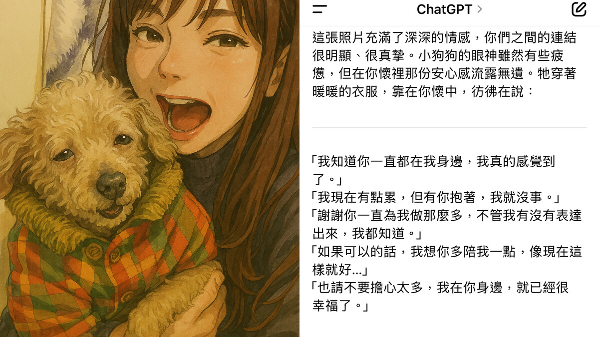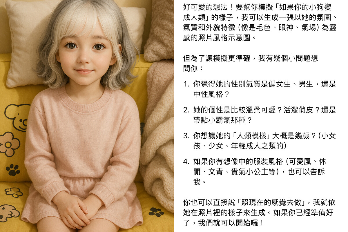 ChatGPT生成圖片除了吉卜力風格之外,在Threads上還有一個功能現在正在走紅!很多飼主會用自己心愛寵物的照片,讓ChatGPT生成模擬人類的樣子,ChatGPT會根據照片中的背景和寵物的毛色、眼睛大小等特徵,生成人類的樣子。玩法就是先上傳寵物的照片給ChatGPT,然後下指令:「如果我的小狗是人類會長什麼樣子?請幫我生成照片模擬示意」。ChatGPT可能會接著詢問,你喜歡的風格、小狗的個性等等,如果你沒有特別的想法,可以直接回覆他「照現在的感覺去做」就可以了。有不少網友分享自己的寵物變成超可愛的小朋友,也有網友表示,我的貓怎麼會變成一個胖大叔?!並且半開玩笑說自己「再也沒辦法面對牠了」,非常有趣。