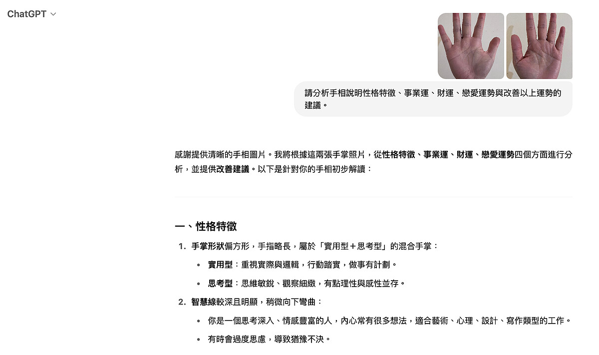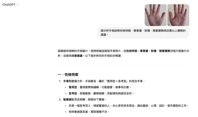 ChatGPT看手相網友意外發現超準!因此也在網路上引起熱門討論。想讓ChatGPT看手相,首先建議在光源良好的地方拍攝左右雙手的手掌照片,並且上傳給ChatGPT,然後告訴ChatGPT:「我是右撇子,請分析手相說明性格特徵、事業運、財運、戀愛運勢與改善以上運勢的建議」如果沒有註明自己的慣用手,ChatGPT會以你是右撇子來做手相分析。ChatGPT會根據手掌的形狀、智慧線、事業線、生命線等等的細節來分析,可以提供事業運、財運、戀愛運、結婚運、健康運等的建議,實測結果真的如網友所說,準到有點嚇人!推薦一定要玩玩看。