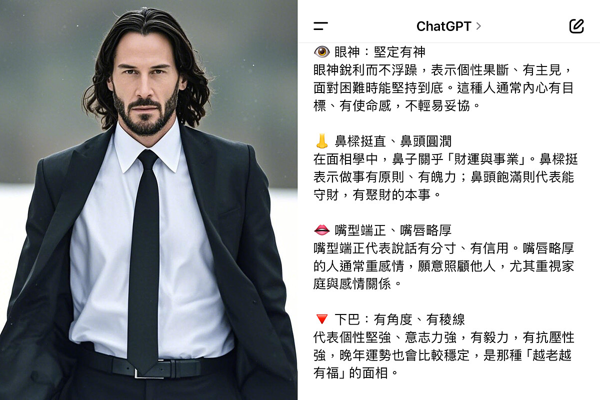 既然能看手相,當然ChatGPT 看面相也難不倒它,同樣的道理,只要拍攝自己正面清晰五官的照片上傳給ChatGPT,並且下達指令:「幫我看面相算命」就可以了。ChatGPT會從照片觀察你的眼神、五官特徵,甚至額頭和髮際線等,分析你的個性和運勢,也能夠提出一些讓運勢更好的建議。