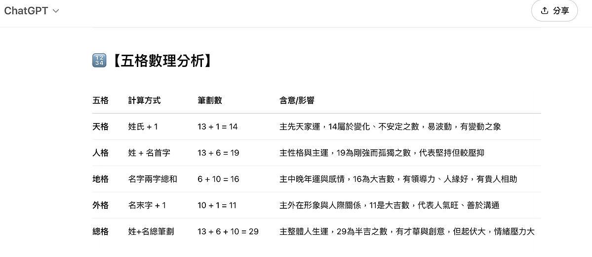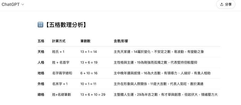 ChatGPT算命也能從姓名學來分析,指令就更簡單了:「我的姓名是XXX,請從姓名學的角度來分析我的個性和運勢,需不需要改名」。ChatGPT會根據姓名五格數理分析,還有筆畫分析,來解析姓名是大凶還是大吉,有沒有立即改名的需求。或是如果要取一個藝名或是筆名,他也能提供選項讓你挑選,甚至從姓名延伸出幫你設計個人品牌、Slogan等整體服務。