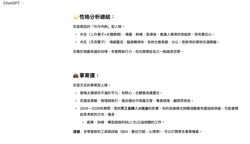 不過還是要提醒:ChatGPT無法真正判斷寵物健康或年齡,只是根據圖片描述和一般寵物行為特徵生成推測內容,屬模擬和娛樂性質,非專業診斷;同時ChatGPT可根據輸入資料生成紫微斗數、星座等解讀,但因缺乏專業占星軟體支持,結果僅供參考,可能會有誤差,需審慎使用參考。