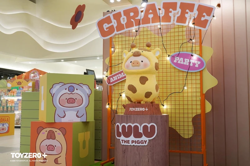 這次LuLu豬換上森林系動物裝扮,與長頸鹿Lu、鱷魚Lu、大象Lu等好朋友一起舉辦「無憂動物村」派對。光是入口就有高達4公尺的大象Lu氣偶站崗,快閃店佔地40坪,打造出露營風拍照區、森林秘境感濃厚的拍貼機、扭蛋區和週邊牆,每一步都充滿驚喜。