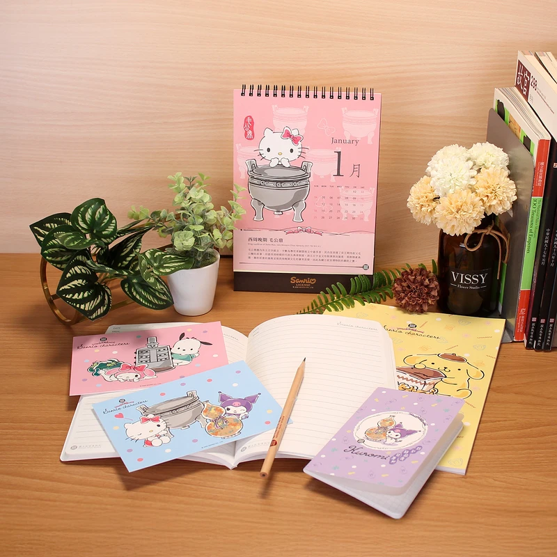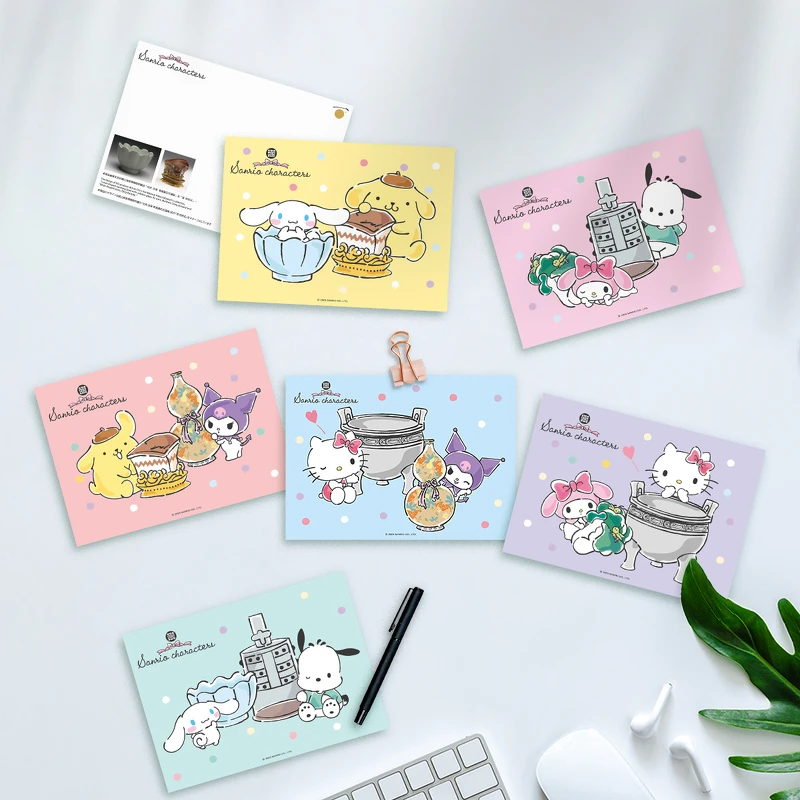除了桌曆,三麗鷗粉絲還能收藏同系列「明信片」與「筆記本」,將這些文物互動場景化作日常陪伴。大耳狗喜拿乖巧坐在青瓷蓮花式溫碗上,神情寧靜,帕恰狗則認真敲響宗周鐘為大家祈福,每一款圖樣都兼具文物質感與角色魅力,實用性與收藏價值兼具。