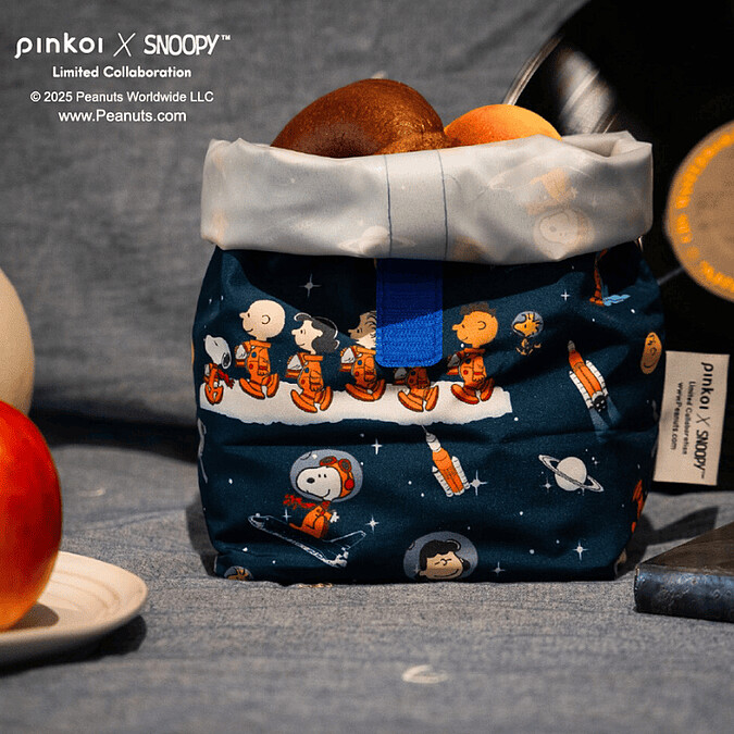 好日子與 Pinkoi 及 SNOOPY 聯名的 pockeat 食物袋,防油、防水、防異味,三明治、便當、湯品都能裝袋自如,折起來僅掌心大小,方便日常隨身攜帶。