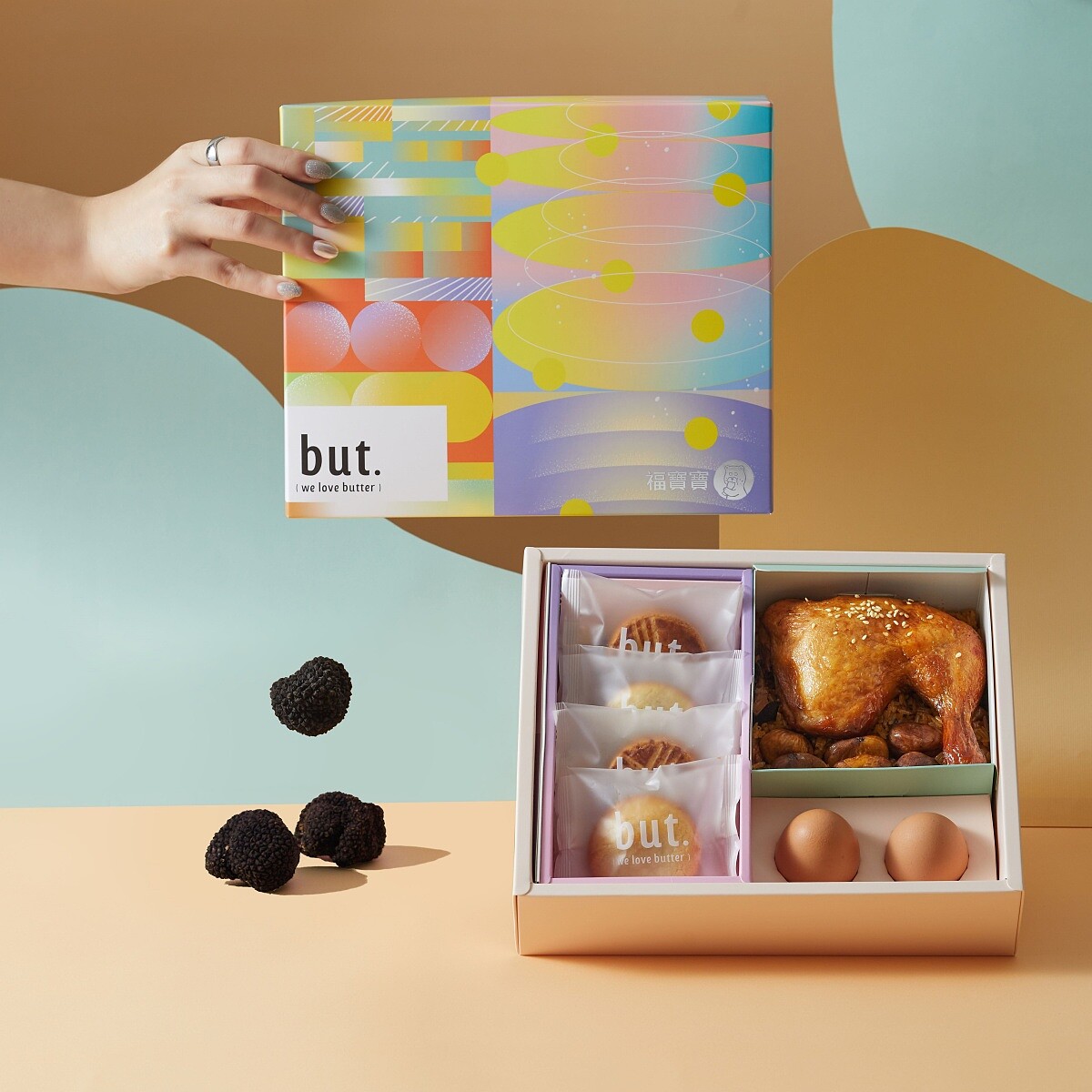 而這次合作也融合兩個品牌對「送禮」的新提案,福寶寶期望延續傳統的節慶氛圍與家常味,but. we love butter 則注入法式甜點的細膩風格。以不追求誇張設計,而是讓禮物回到最單純的心意。黑松露油飯代表家的味道,焦糖圓餅象徵新的開始。福寶寶與 but. 希望這份禮盒提醒人們:無論人生在哪個階段,每一次重新出發都值得被慶祝。