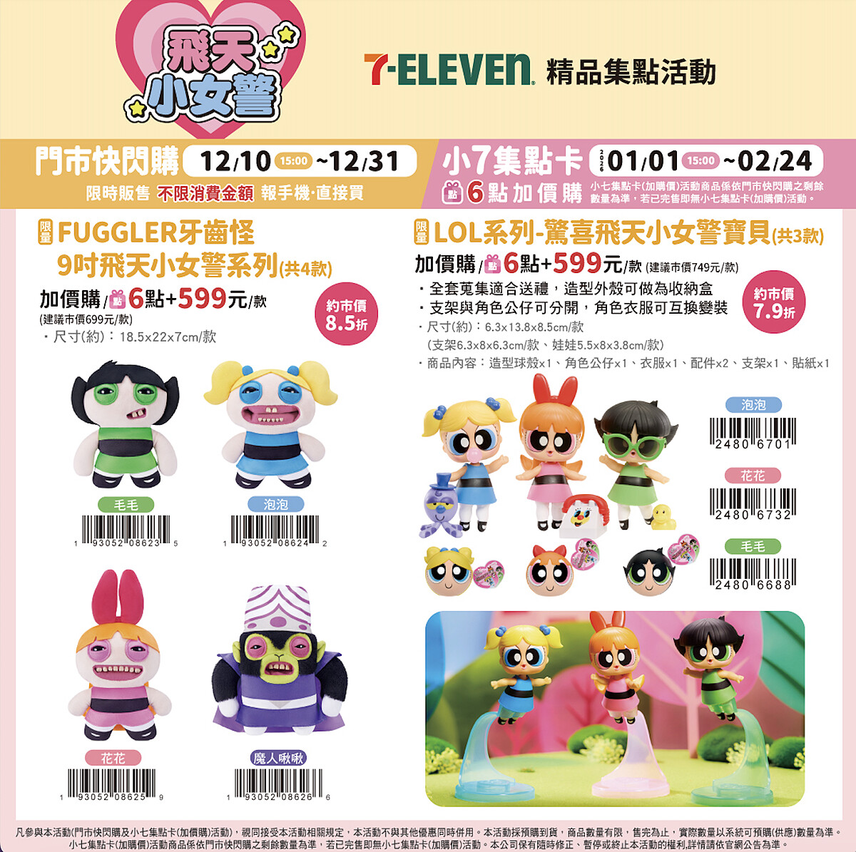 首波焦點是與國際知名潮玩品牌FUGGLER的跨界聯名,FUGGLER以其標誌性的「露齒」怪萌造型風靡全球,在粉絲間有「牙寶」或「放克牙寶」的稱號,是以其故意設計的怪異、甚至有些醜萌的外觀著稱,最大的特色就是那逼真的「人造牙齒」。而這次7-11特別引進FUGGLER與飛天小女警聯名,首度將可愛的花花、泡泡、毛毛,以及經典反派魔人啾啾(售價$599/款),全都化身為超怪萌的絨毛娃娃。這種衝擊性的反差萌設計,讓它在社群媒體上引發熱議,許多網友表示越看越可愛,並強調一定要買到的決心,收藏度瞬間爆表。