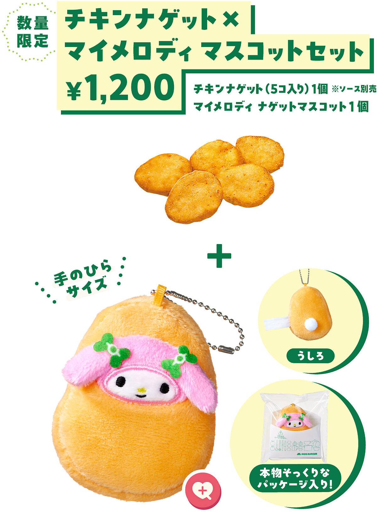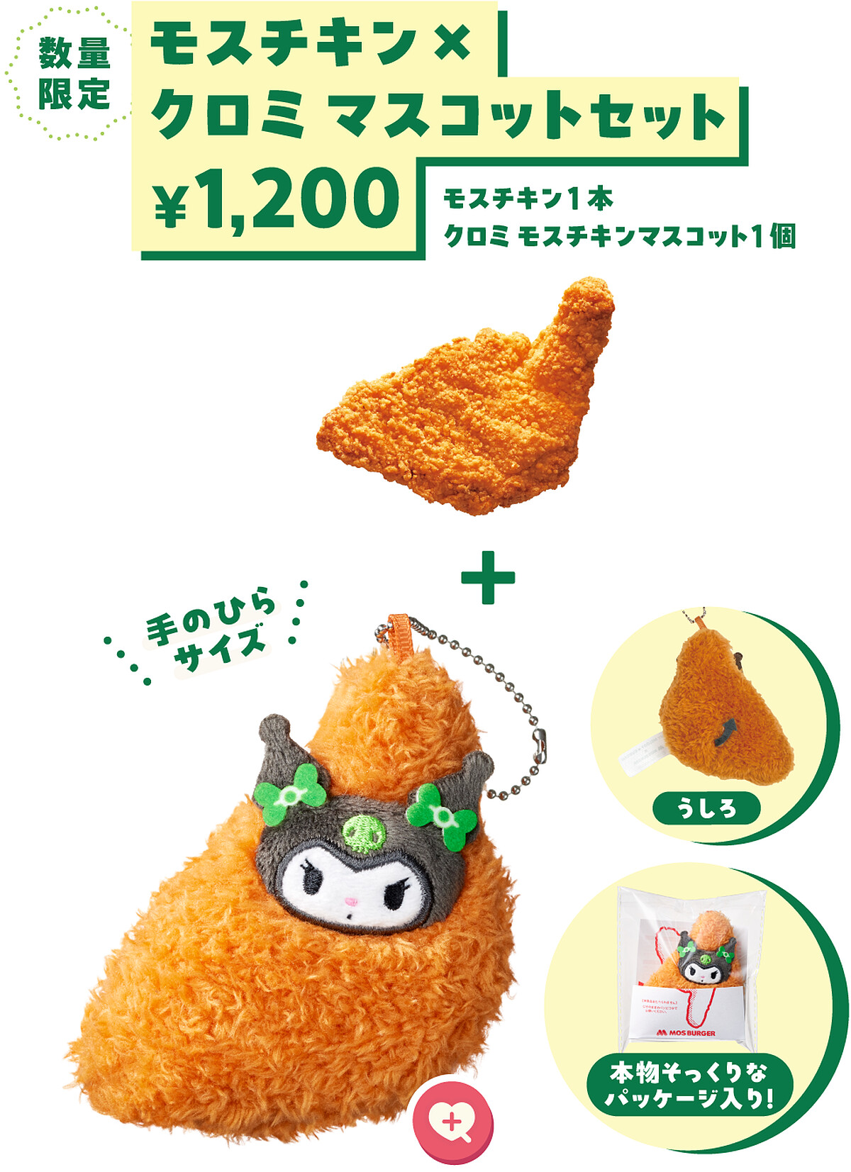 套餐內容包含一份5入的摩斯雞塊,以及一款美樂蒂造型的雞塊絨毛吊飾。吊飾以摩斯經典雞塊為造型基礎,搭配美樂蒂粉嫩的臉部、經典的粉色雙耳刺繡,整體造型澎軟可愛,並附有金屬鍊條,可隨身攜帶。酷洛米摩斯炸雞套餐另一款套餐則包含一支摩斯炸雞,以及酷洛米造型的炸雞絨毛吊飾。設計靈感來自外酥內嫩的摩斯炸雞,保留了酷洛米標誌性的黑色頭巾與骷髏圖樣,完美演繹其「又壞又可愛」的反差魅力。