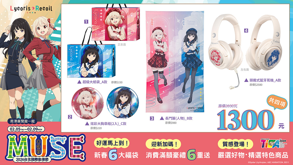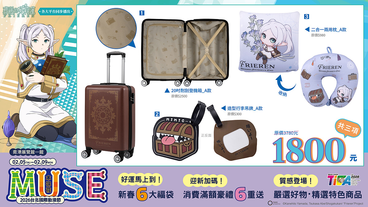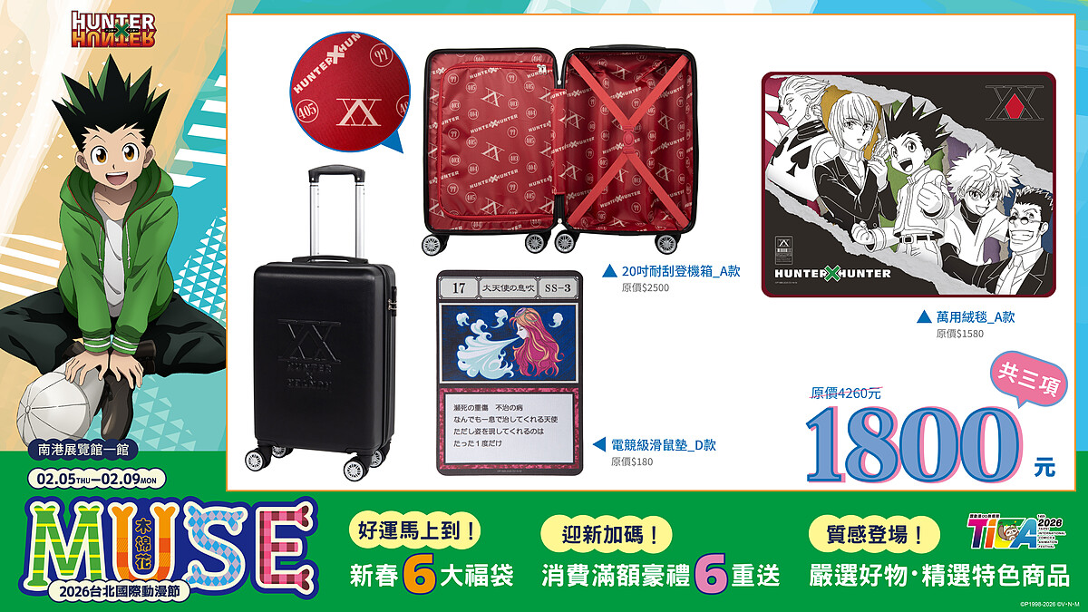 《Lycoris Recoil 莉可麗絲》推出木棉花獨家千束、瀧奈特繪圖款福袋,內含頭戴式藍牙耳機、長門簾與炫彩大胸章,限定圖素與品項一次到齊;《HUNTER×HUNTER 獵人》福袋則以角色萬用絨毯、獵人協會LOGO登機箱與電競滑鼠墊組成,低調但份量十足。《葬送的芙莉蓮》本次推出A、B兩款福袋。A款以和服掛軸搭配頭戴式藍牙耳機,適合居家使用;B款則結合二合一兩用枕、寶箱怪行李吊牌與魔導書造型20吋耐刮登機箱,出遊需求一次到位。