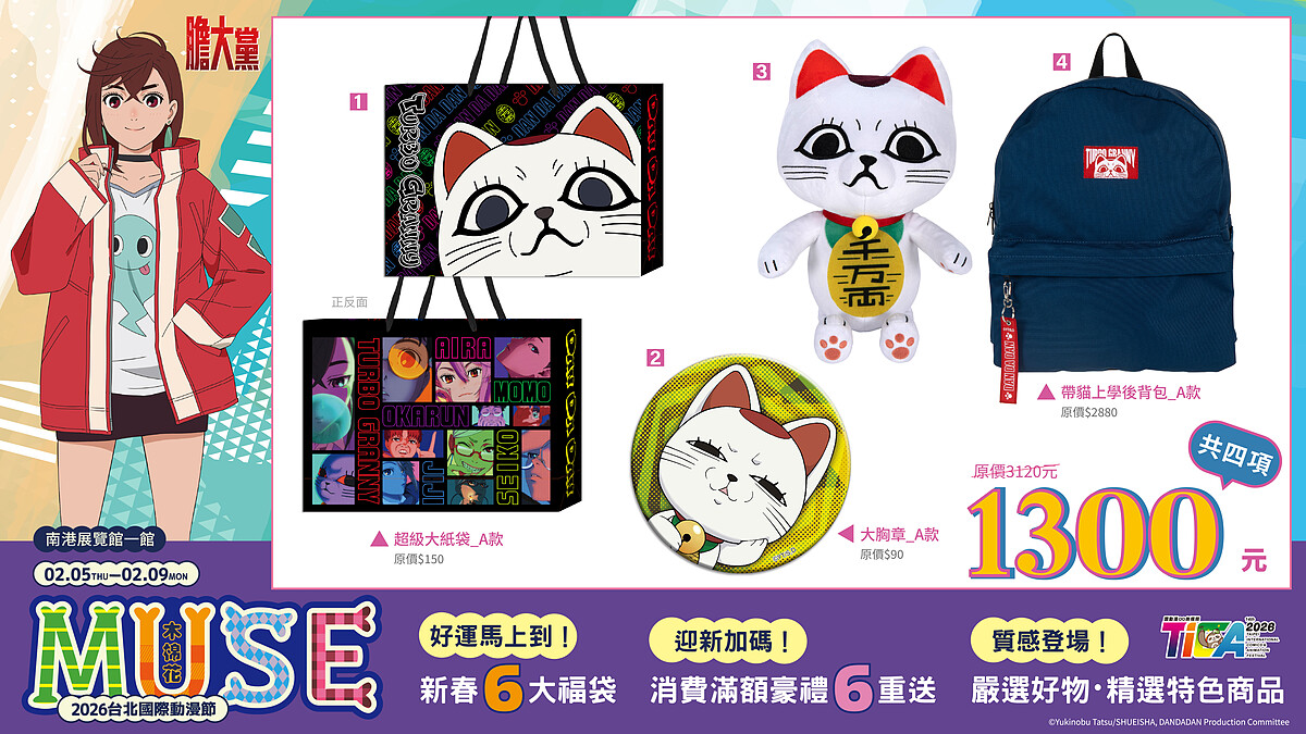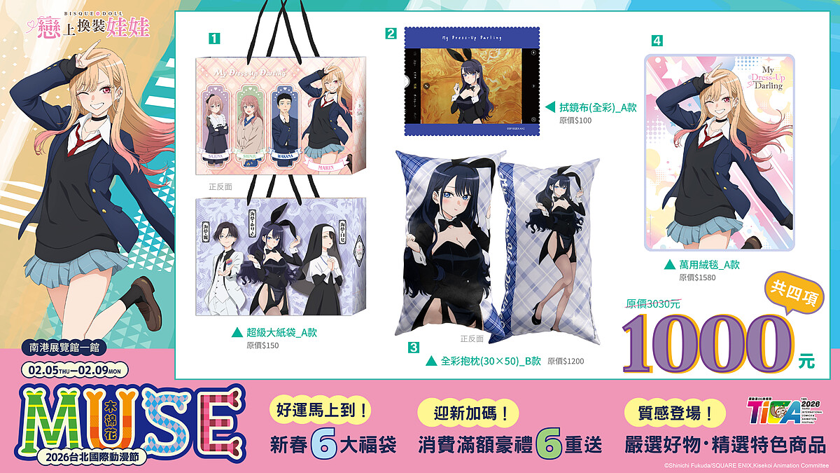 木棉花國際推出的新春六大福袋,最低1,000元即可入手市值3,030元以上的限定商品,鎖定多部人氣作品,主打高實用度與高收藏度兼顧。《戀上換裝娃娃》福袋以萬用絨毯、全彩抱枕、拭鏡布與超級大紙袋,完整收錄海夢的制服造型與多樣COS樣貌;《膽大黨》則將高速婆婆貓型態絨毛玩偶與實用後背包組合,日常背出門就能完成作品名場面。