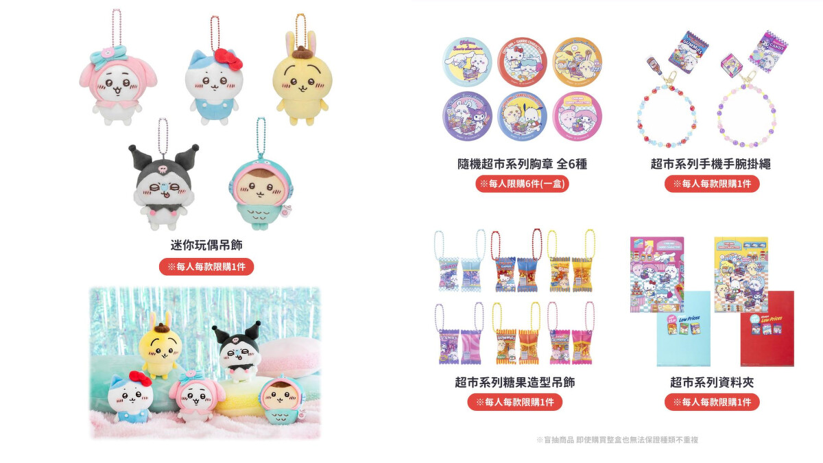 此外快閃店也推出多款以超市為靈感的創意商品,包含零食包裝風格小物、購物集點卡設計周邊、資料夾、貼紙、吊飾、零錢包與購物袋等,從實用型到收藏型一應俱全。