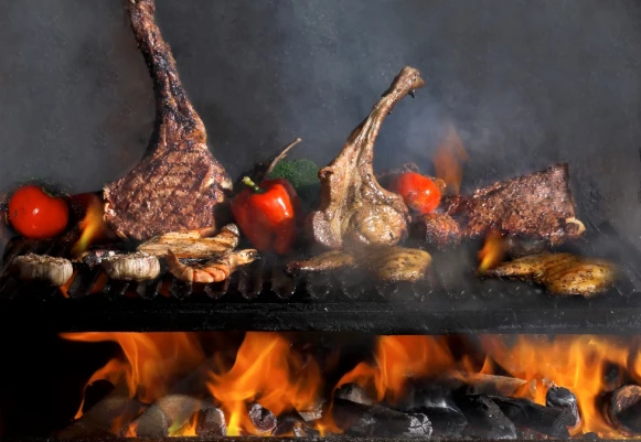長長大木盤讓服務生雙手奮力扛上桌畫面真的百看不膩,直火碳烤厚實大份量豬牛羊排餐一次上桌實在太過癮!