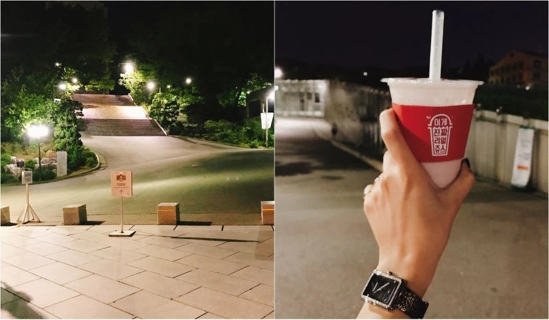 搶在夜晚關燈前來到梨花女子大學裡,雖然趕不及白天拍照的美麗,夜晚的燈光也是別有一番風味,揹著小背包手裡拿著一杯果汁和書本,沿途經過那些剛下課的女大學生,就像Boy.Friend把時間倒轉,回到那一年的學生時代。