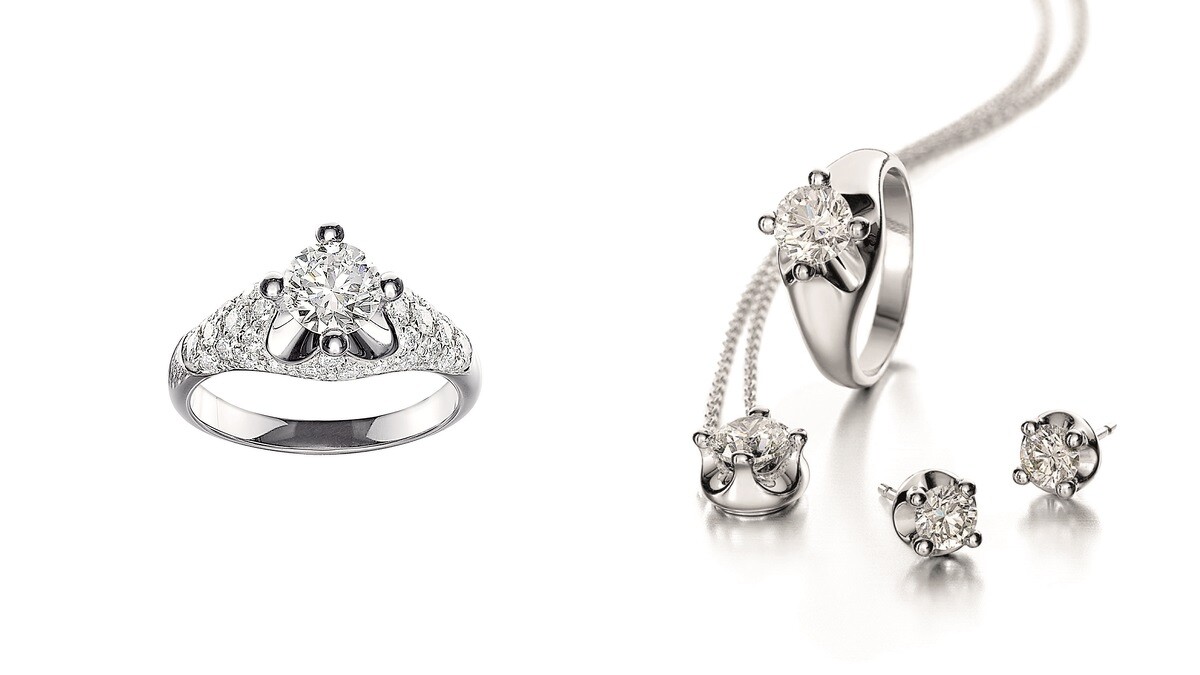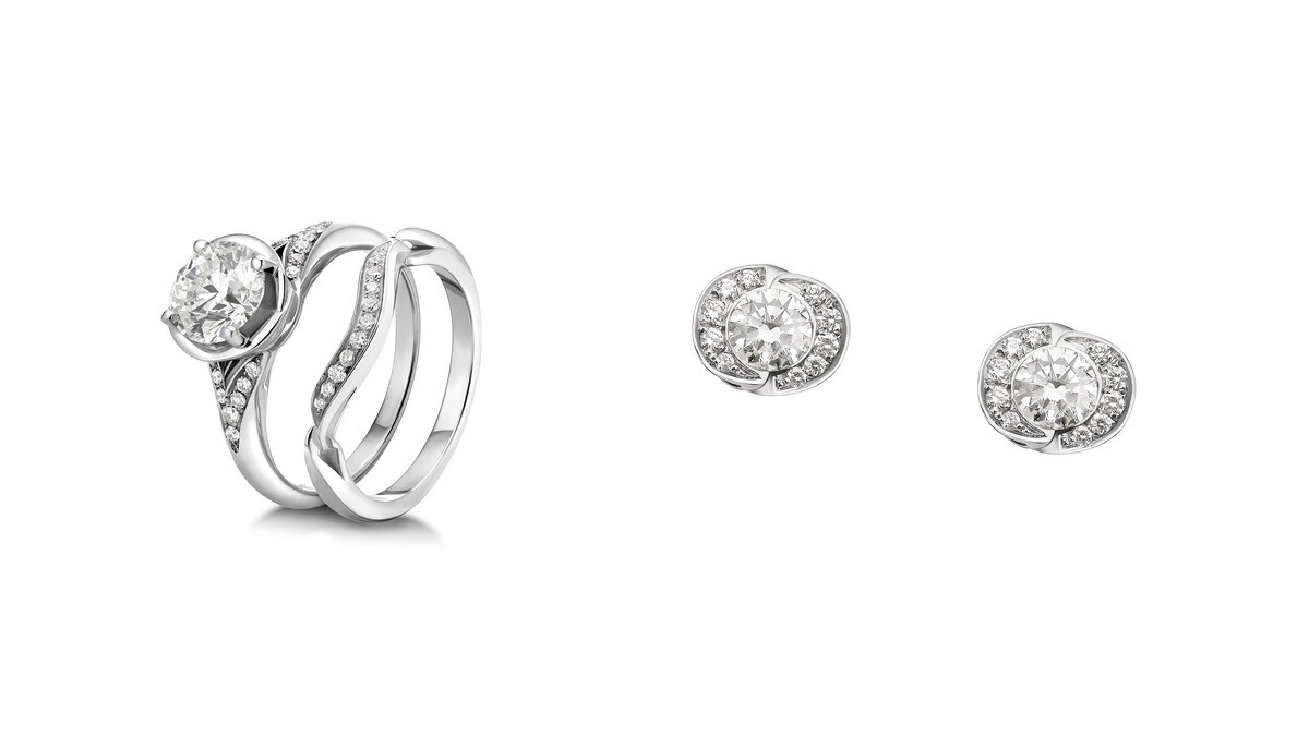 戒指以「光環」設計來捕捉愛情故事的第一道光芒,雙道密鑲鑽石從台座延伸,交匯於耀眼的單顆美鑽,其中也推出密釘鑽石耳環、白K金鑽石項鍊的整組珠寶,給準新人一整套永恆的紀念。