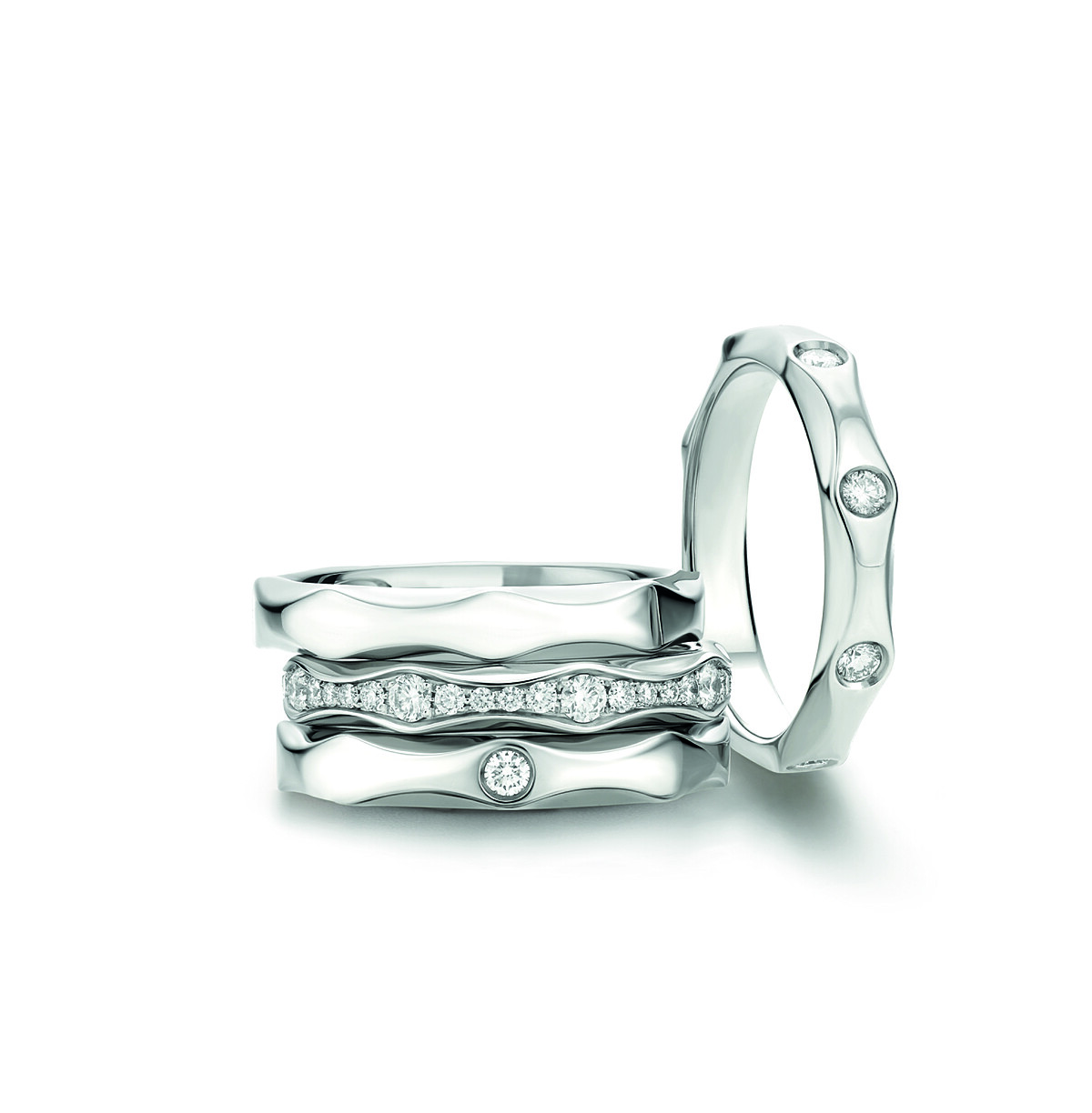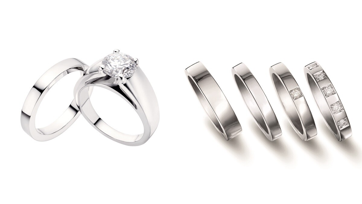 今年推出四款設計,以簡約的幾何造型表現出現代感風格,注入玫瑰金材質,鑲嵌單顆或多顆璀璨鑽石,散發出搶眼時髦的婚戒作品。