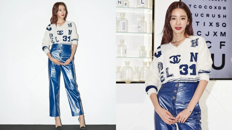 同樣身為香奈兒品牌大使的Irene Kim,在造型上則選擇了優雅與率性兼具的風格單品,像是字母印花針織上衣和金屬質感的小羊皮褲,展現柔與剛並濟的氛圍,又或將18K黃金項鍊與鑲嵌著29顆明亮式切割鑽的18K白金項鍊…透過鑲鑽與無鑲鑽、白金與黃金色調,層疊混搭出充滿個人風味的美學組合。