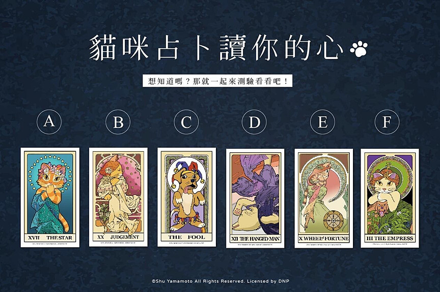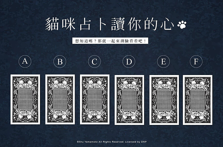 請先放輕鬆,從下圖中A到F共6張卡牌中依照直覺選出1張,讓貓咪為你讀出潛意識裡的專屬秘密。