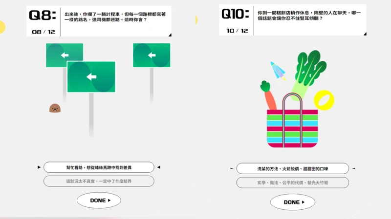 「你將開始一段旅程,深呼吸,放鬆下來,探索內心最原始的想法。」開始測驗前,背景為「環」的動畫設計搭配引導,每道題目都是2選1的選項,在不同的旅程情境中作出抉擇,是個短短不到3分鐘,就能完成的心理測驗。