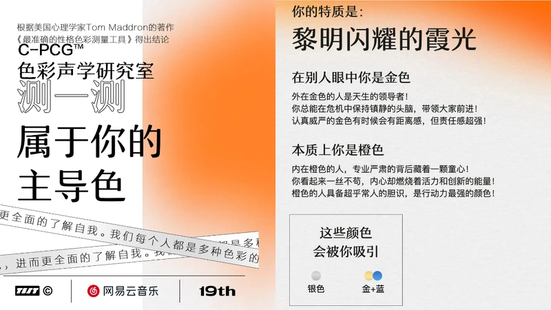 根據MBTI理論編制8款音樂,並針對動畫效果,做出自己覺得符合當下情境的選擇。簡短的問題和一問一答的方式讓大家可以憑直覺快速做出決定,最後根據美國心理學家Tom Maddron著作《最準確的性格色彩測量工具》分析你是哪一種顏色,分別是別人眼中的你和本質上的你,還可以知道自己和什麼顏色個性的人比較適合,或是要遠離哪些顏色的人。
