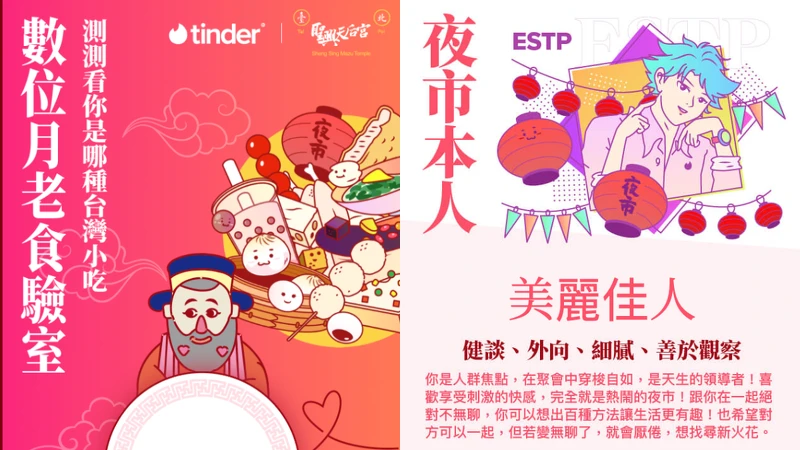 交友軟體Tinder和臺北聖興天后宮月老攜手合作,想知道你是哪種台灣夜市小吃、哪種小吃跟你又最速配嗎?這款心理測驗的問題需要稍微思考一下,12題的問題與生活觀、愛情觀有關,目前已經有百萬網友測試過。