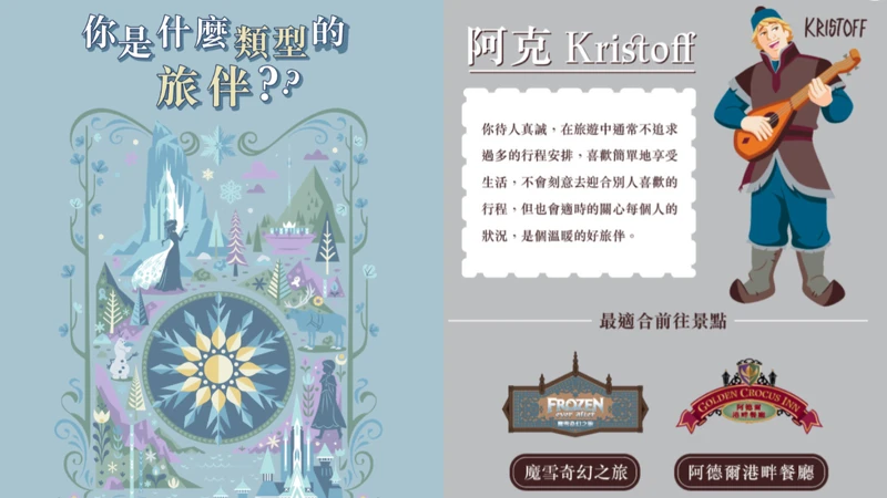 全球首座《冰雪奇緣》主題園區「魔雪奇緣世界」已於2023年11月20日在香港迪士尼登場!快點搶先透過這個測驗探索艾倫戴爾王國,透過7道問題測驗自己是哪種旅伴吧。除了可以知道自己在旅行時的個性和《冰雪奇緣》哪位角色相似外,也可以看看你的最佳旅伴是誰喔。
