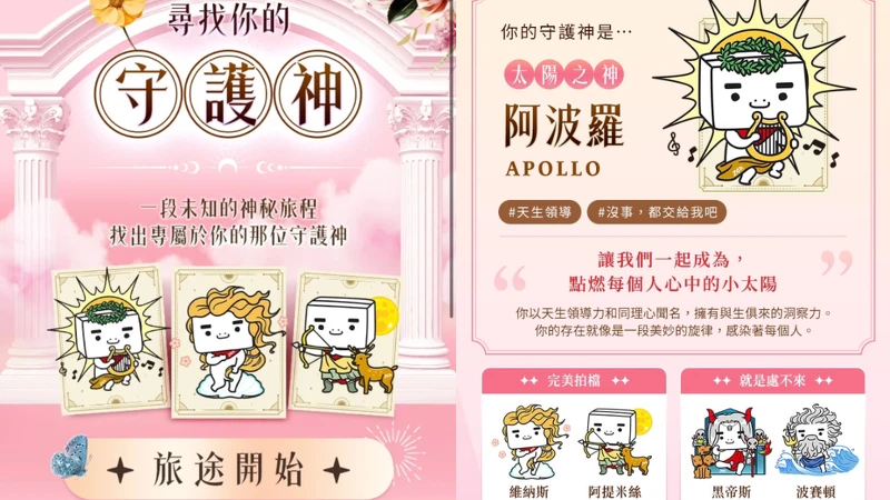 以「你在山林小徑遇到一位神祕的陌生人,你希望從他身上得到什麼?」展開神秘之旅,簡單8道題目可以測驗出你的守護神是哪位神話天神,更可以知道你天生的一些個性特徵。