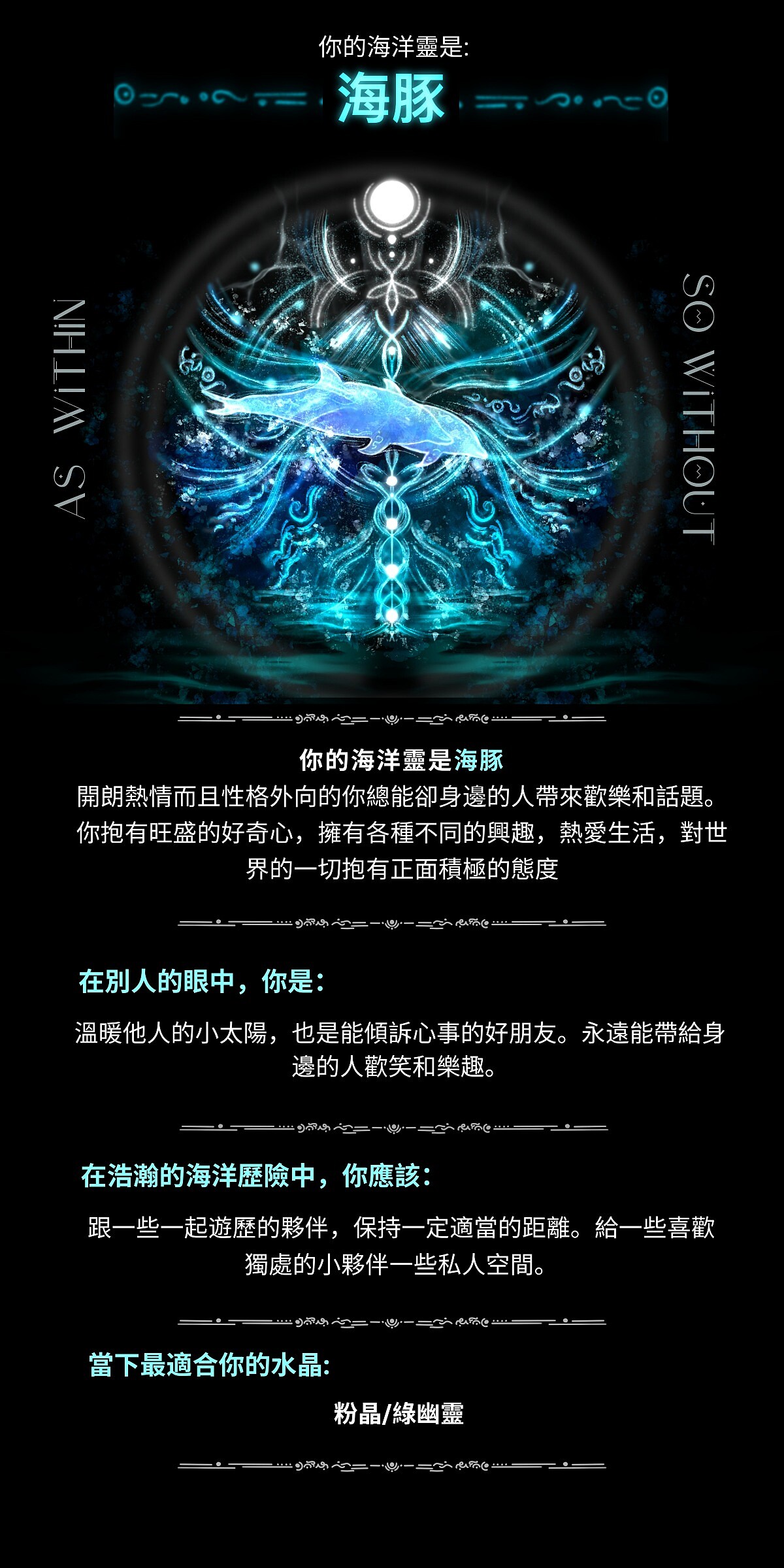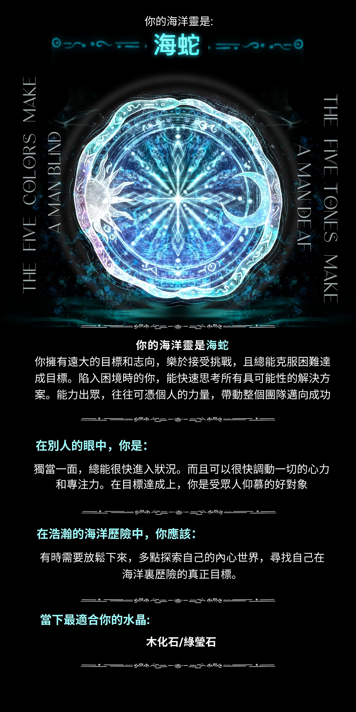 最後結果除了顯示自己是甚麼海洋動物,從海豚、海龜、海蛇應有盡有,先分析自己的行為模式,也會提到自己給他人的印象,更會給出在人際關係中的建議,不再只是一種自嗨式的測驗,而是可以實踐於生活中。