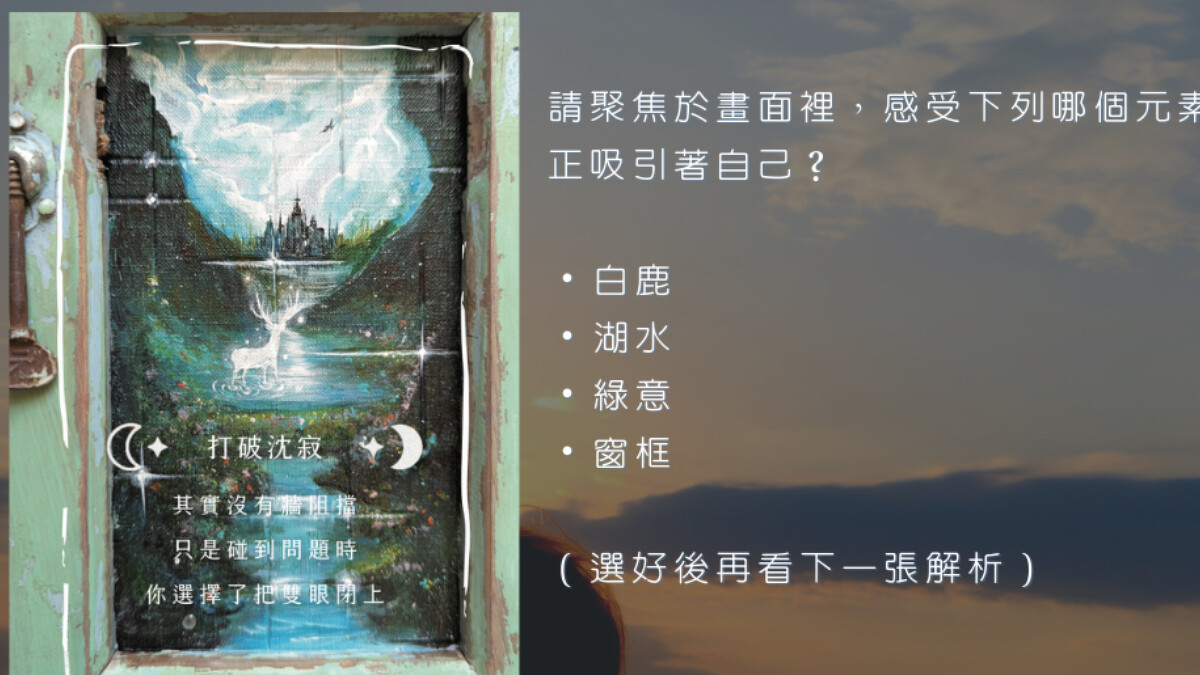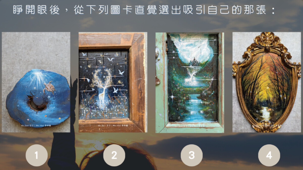 催眠師「Mo Jhen芸子」從藝術家「去哪裡都行」的作品選出4幅畫,只要以直覺選出其中一張指引卡,就可以知道得到你今年將開啟什麼生命功課。