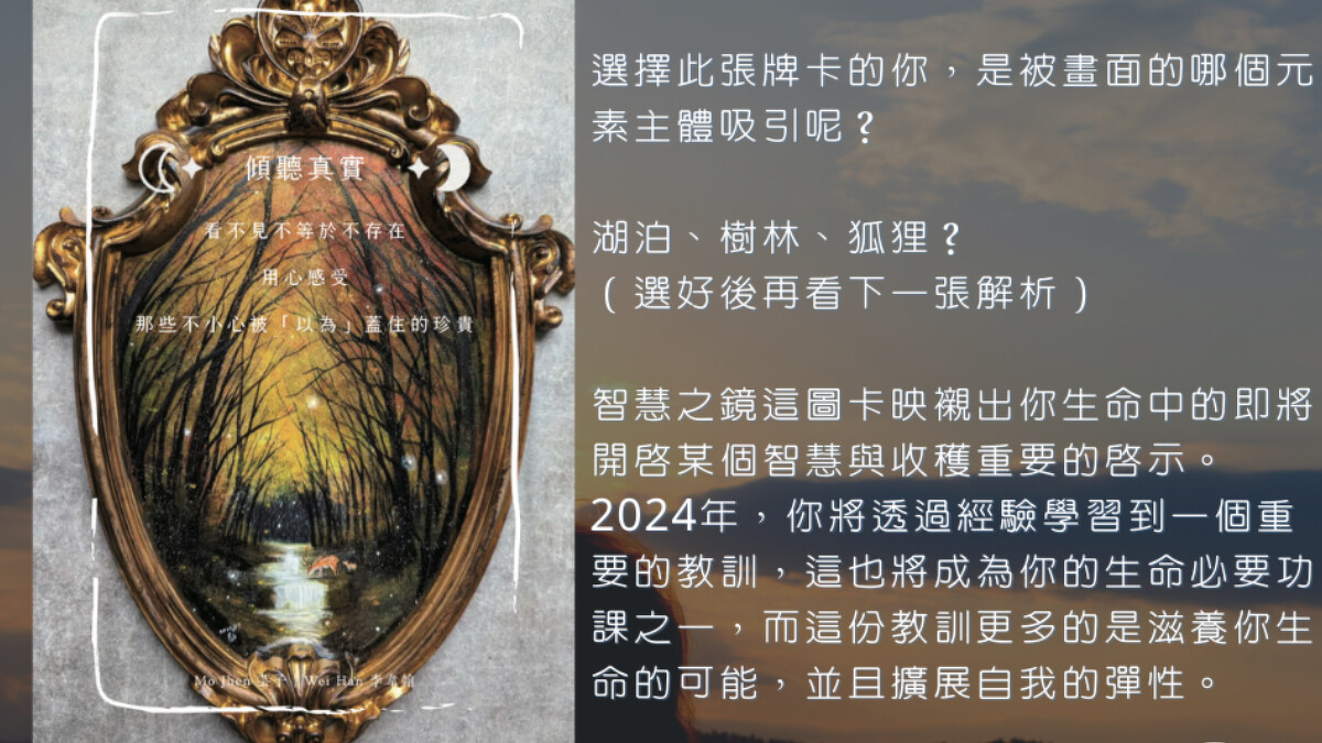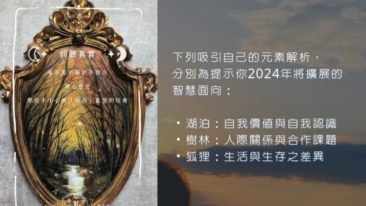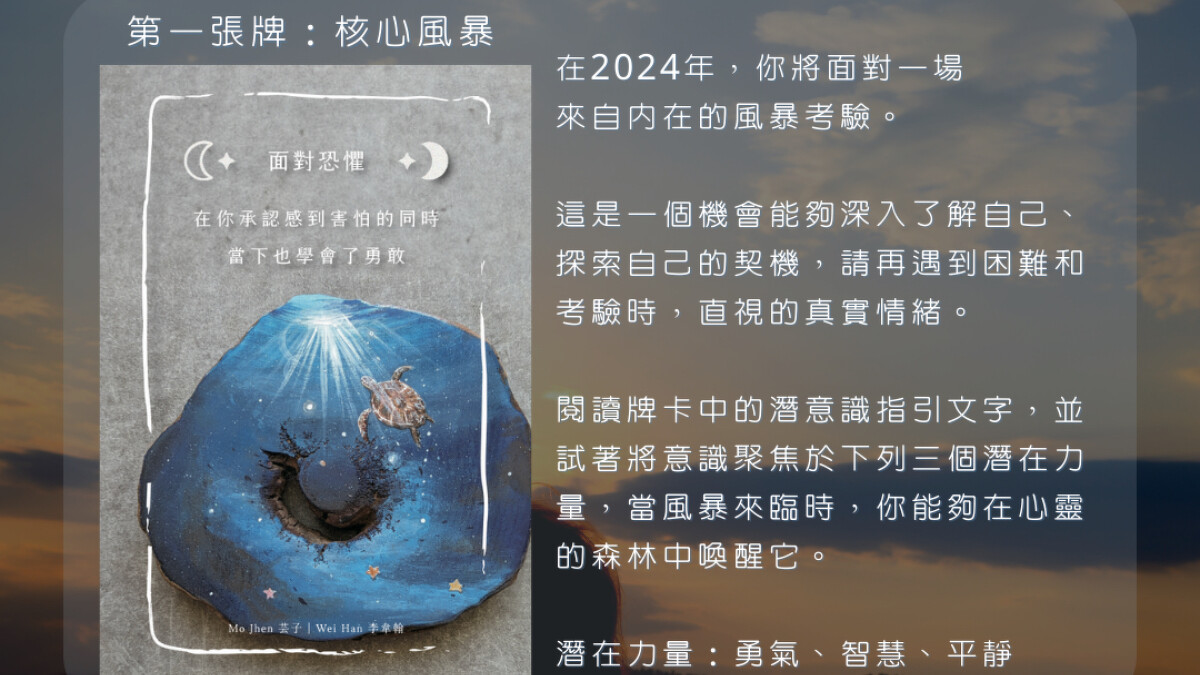 在2024年,你將面對一場來自內在的風暴考驗。這是一個能深入了解自己、探索自己的契機,請在遇到困難和考驗時,直視內在的真實情緒,並試著將意識聚焦於勇氣、智慧、平靜三個潛在力量,當風暴來臨時,你能夠在心靈的森林中喚醒它。