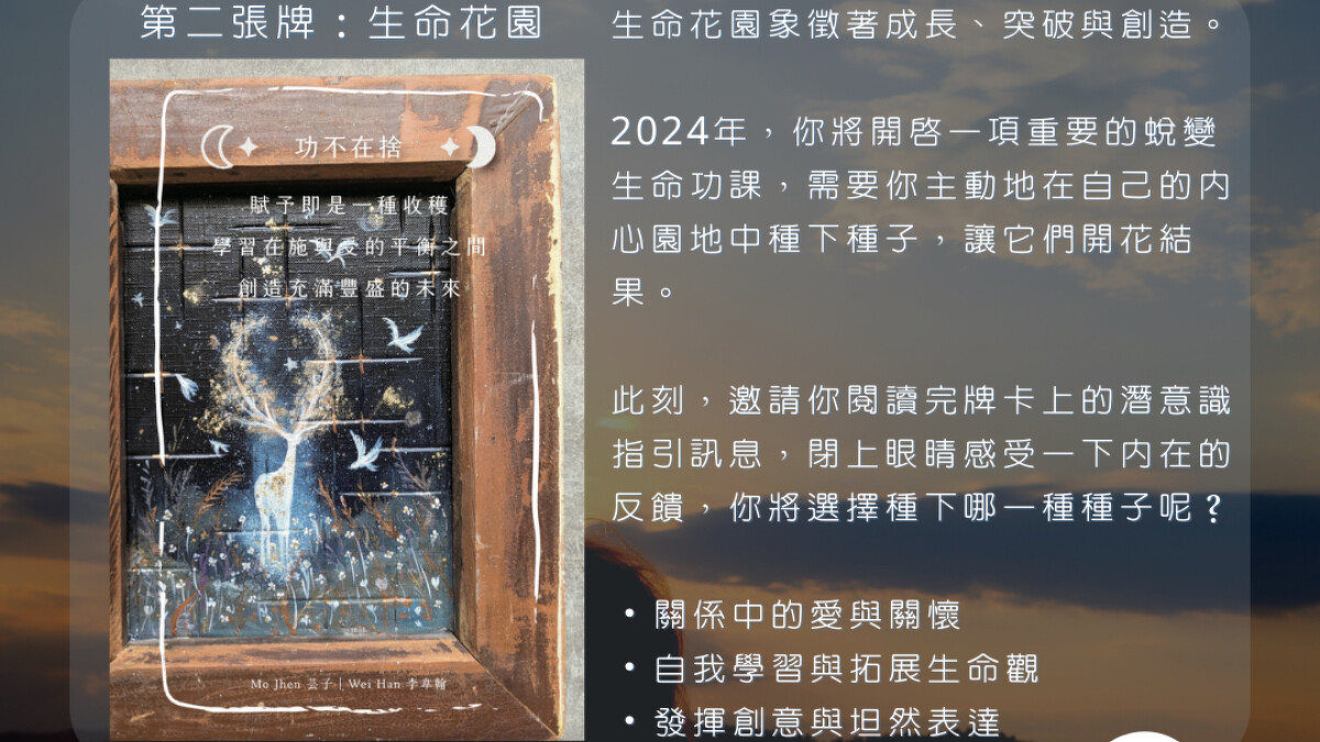 生命花園象徵著成長、突破與創造。在2024年,你將開啟一項重要的蛻變生命功課,需要你主動地在自己的內心園地種下種子,讓它們開花結果。