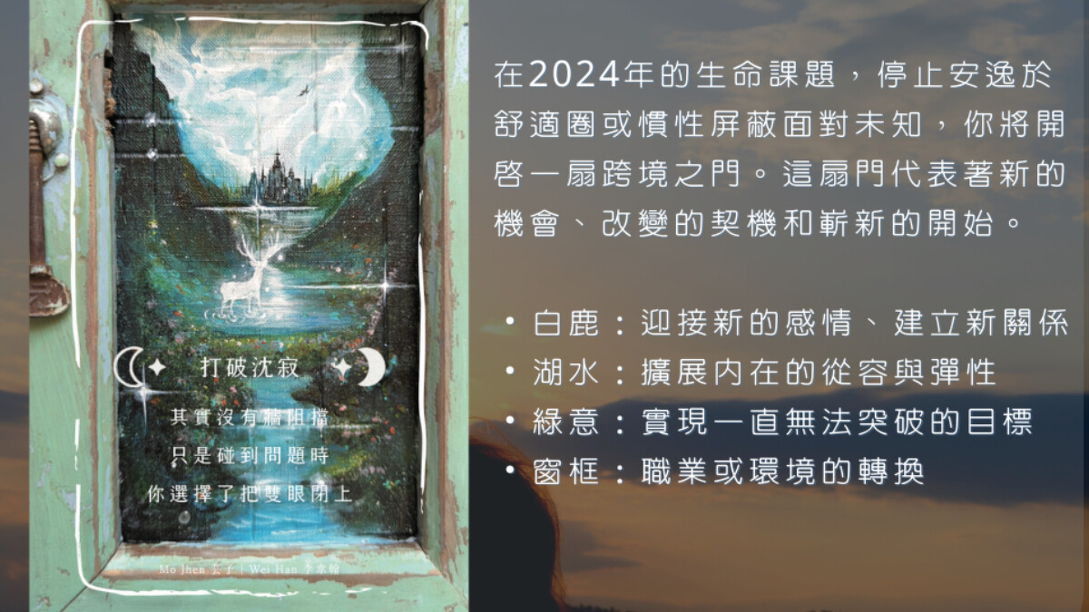 在2024年的生命課題,停止安逸於舒適圈或慣性屏蔽面對未知,你將開啟一扇跨境之門。這扇門代表著新的機會、改變的契機和嶄新的開始。