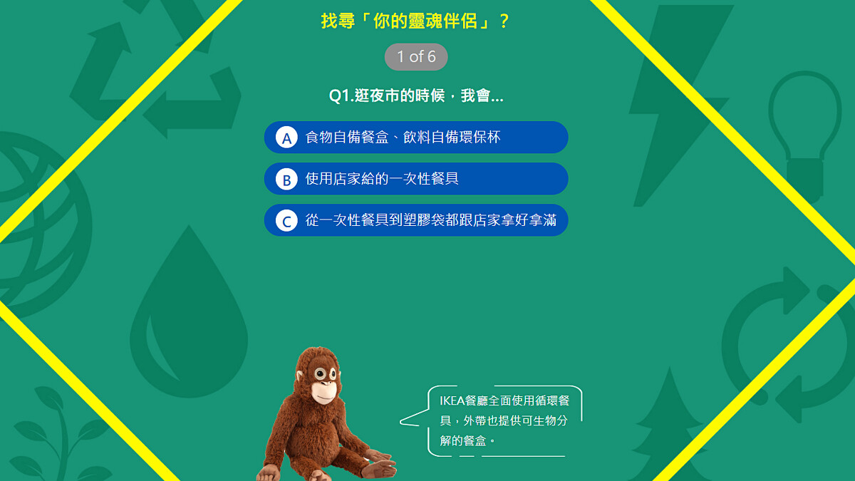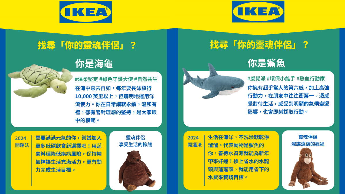 簡單6個題目,囊括逛夜市習慣、犒賞大餐選擇、夏季高溫、冬季取暖方法、換燈泡到沐浴習慣等日常行為,從這些生活細節中便能透露出性格。最終結果會以IKEA招牌動物玩偶分類,超人氣鯊鯊、大棕熊、海龜通通有,剖析人格類型外,更同步公開「靈魂伴侶」絕佳選擇。