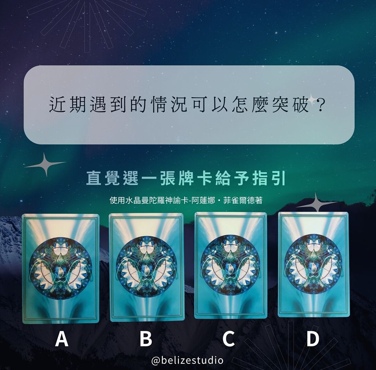 近期遇到的情況可以怎麼突破?請在內心觀想你目前遇到的情況,然後透過直覺選一張牌卡給予指引。本測驗使用水晶曼陀羅神諭卡-阿蓮娜·菲雀爾德 著。