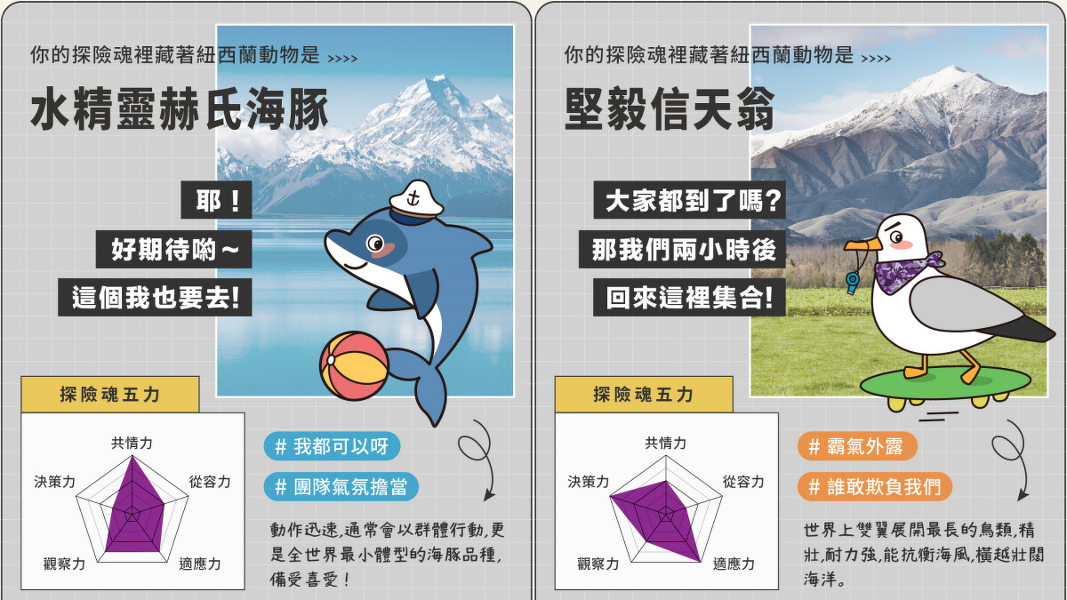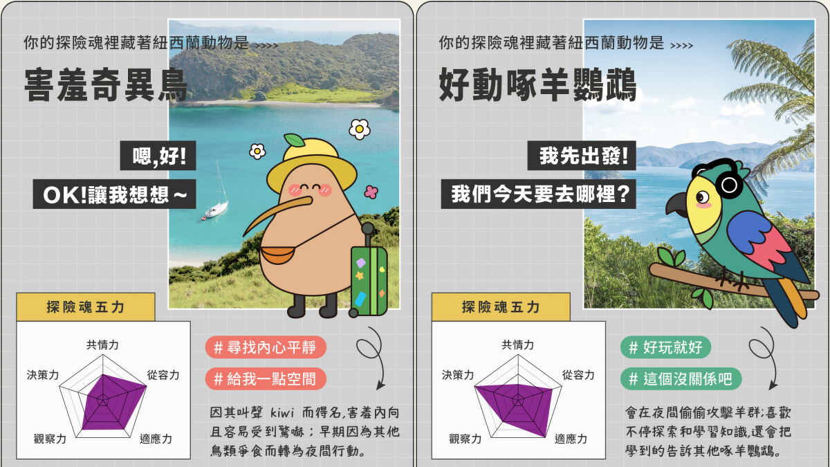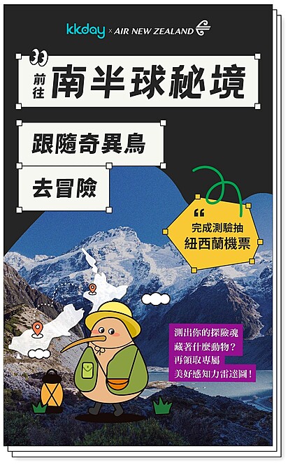 這個由紐西蘭航空及KKday共同推出的可愛心理測驗「前往南半球秘境,跟隨奇異鳥去冒險」,藉由6個問題即可發現隱藏在探險魂下的「紐西蘭動物」!像是奇異鳥擁有神秘的內心世界,期望在旅程中以自己的步調找回平靜;海豚則是有著如水一般的柔和個性,秉持著出色的社交技巧,能快速又輕輕地在團體中找到定位。