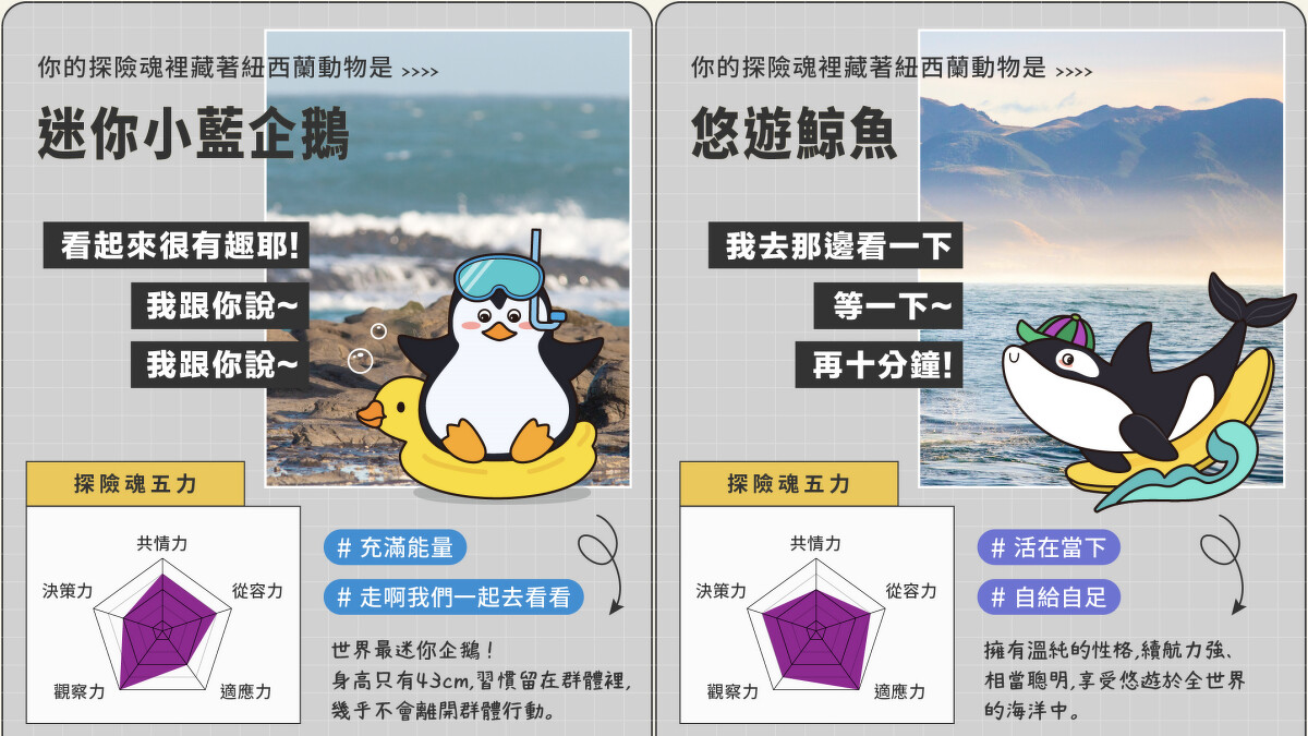 這個心理測驗在上線短短一周內,便吸引超過3萬人搶玩,也帶領廣大網友認識紐西蘭特色動物,如小藍企鵝、信天翁等等,你是哪一種呢?
