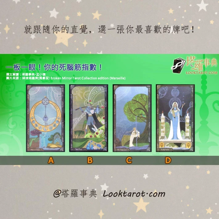 你是個做事一板一眼,臨時遇到狀況也不會變通的人嗎?還是你身邊也有這種死腦筋的人呢?快來玩孟小靖老師的塔羅占卜,看你的死腦筋指數有多高吧!現在就跟隨你的直覺,請依照你的第一印象,選一張你最喜歡的塔羅牌吧!