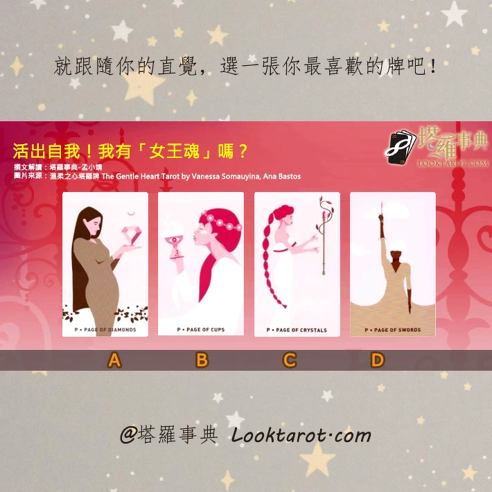 每個女生都希望自己能有好命好運,永遠有人愛、給人養就好嗎?當然不是啊!現在的女生是會勇敢的去追求自己想要的生活,活出自我!完成自己的夢想喔!但是面對這些考驗與挑戰,你可是需要擁有「女王魂」,才能更堅強的解決這些大小事啊!想知道自己有沒有「女王魂」嗎?快來玩孟小靖老師的塔羅占卜,現在就跟隨你的直覺,請依照你的第一印象,選一張你最喜歡的塔羅牌吧!