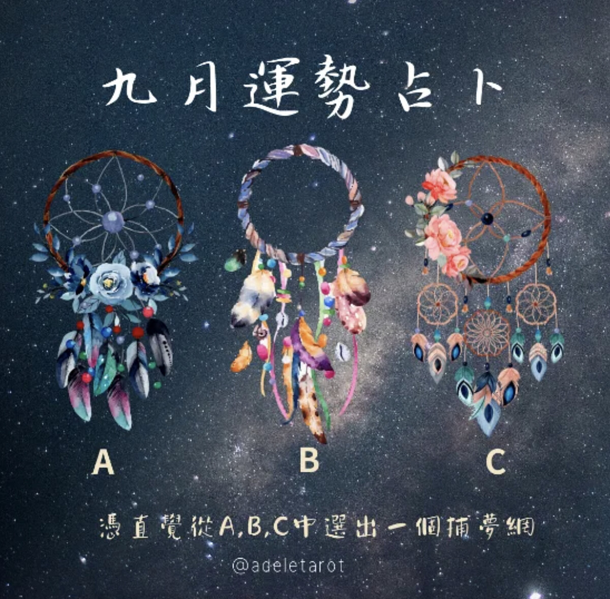 首先,我們先閉上眼睛,花幾秒鐘的時間讓心靜下來。準備好後,就可以睜開眼睛,從 A、B、C 三個選項中選出一張最有感覺的牌