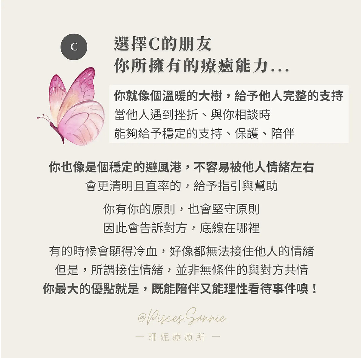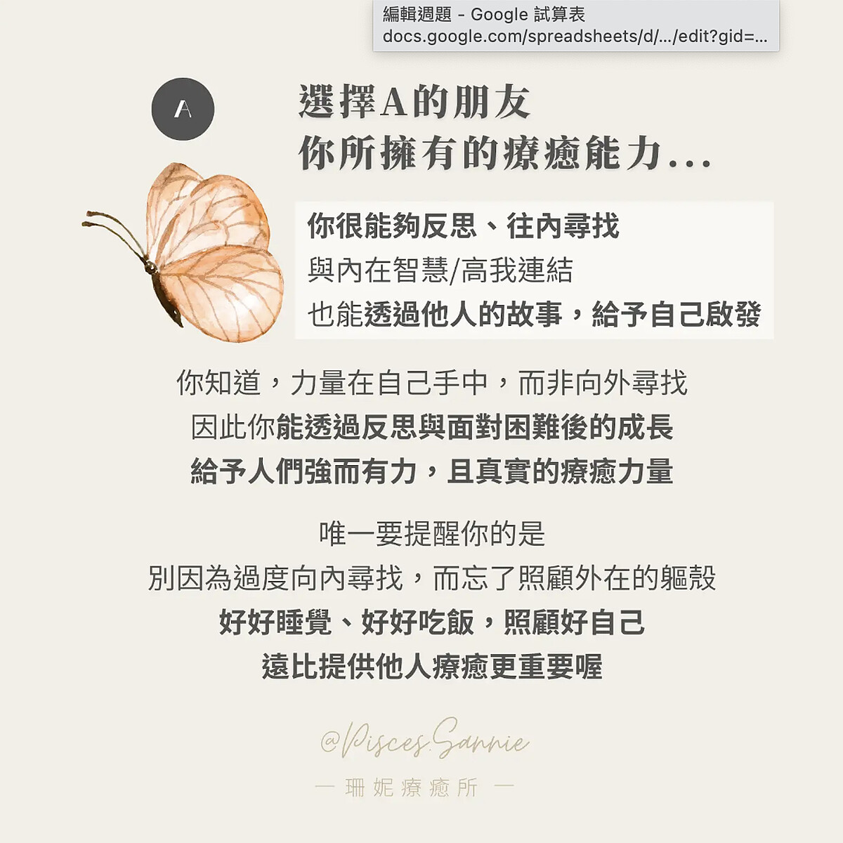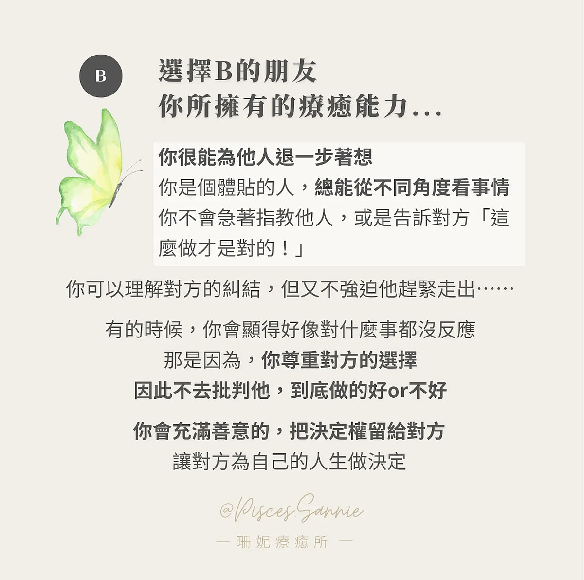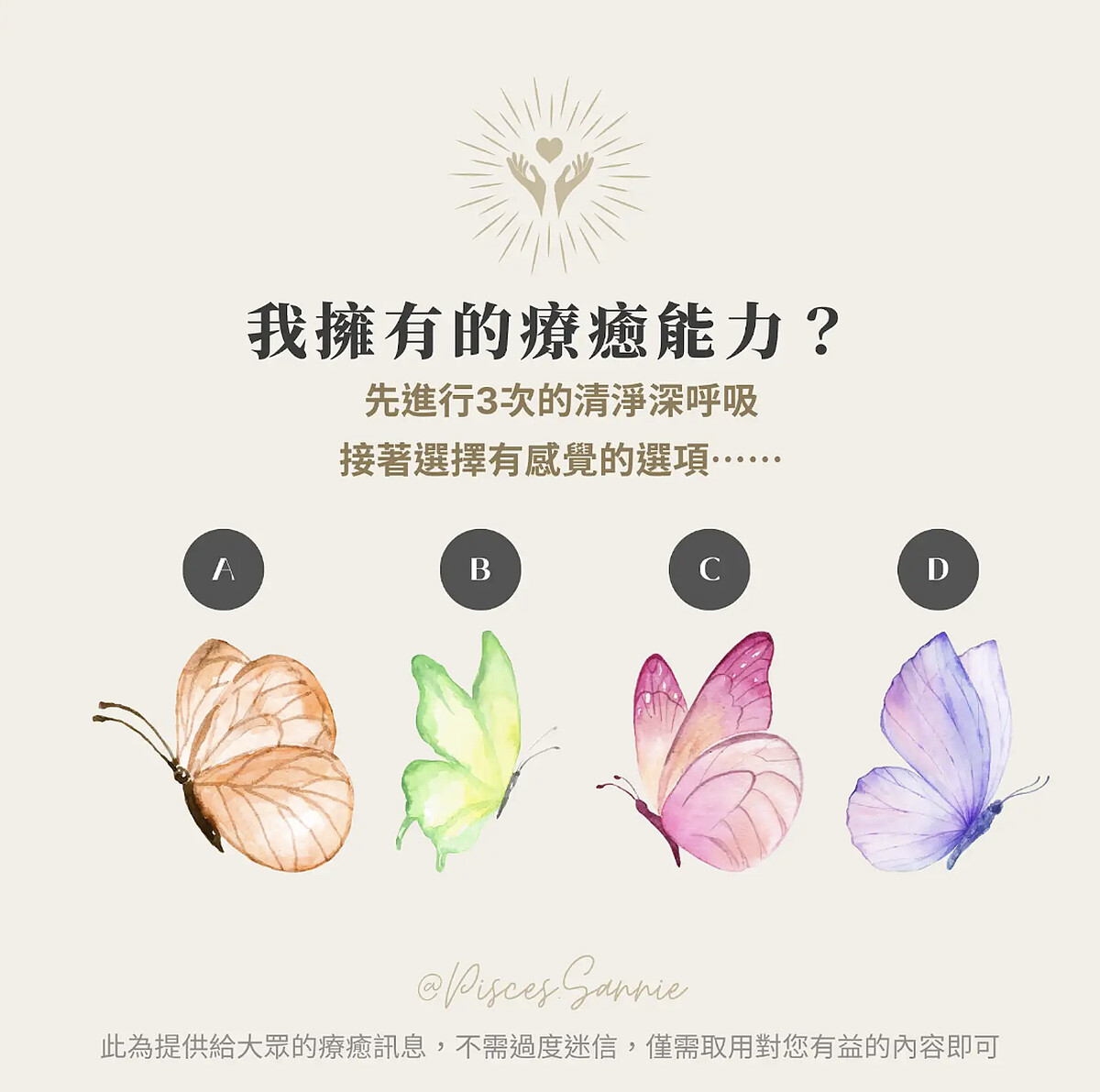 我們每個人都自帶療癒能力!來看看你的療癒能力是什麼?請先進行 3 次的清淨深呼吸,選擇你有感覺的蝴蝶。