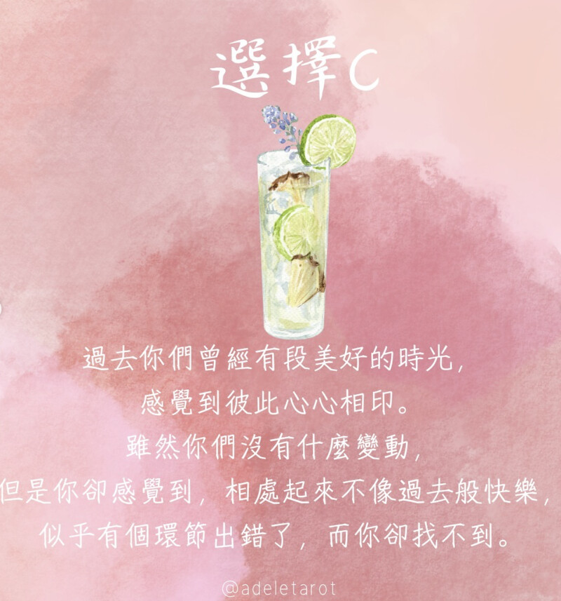 首先,我們先閉上眼睛,花幾秒鐘的時間讓心靜下來。準備好後,就可以睜開眼睛,從A、B、C三個選項中選一杯喜歡的雞尾酒。