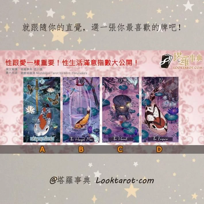 千萬別忽略你的性生活喔!美妙的性生活可是能為你的愛情加分很多喔!快來玩孟小靖老師的塔羅占卜,來看看你有沒有滿意目前的性生活吧!現在就跟隨你的直覺,請依照你的第一印象,選一張你最喜歡的塔羅牌吧!