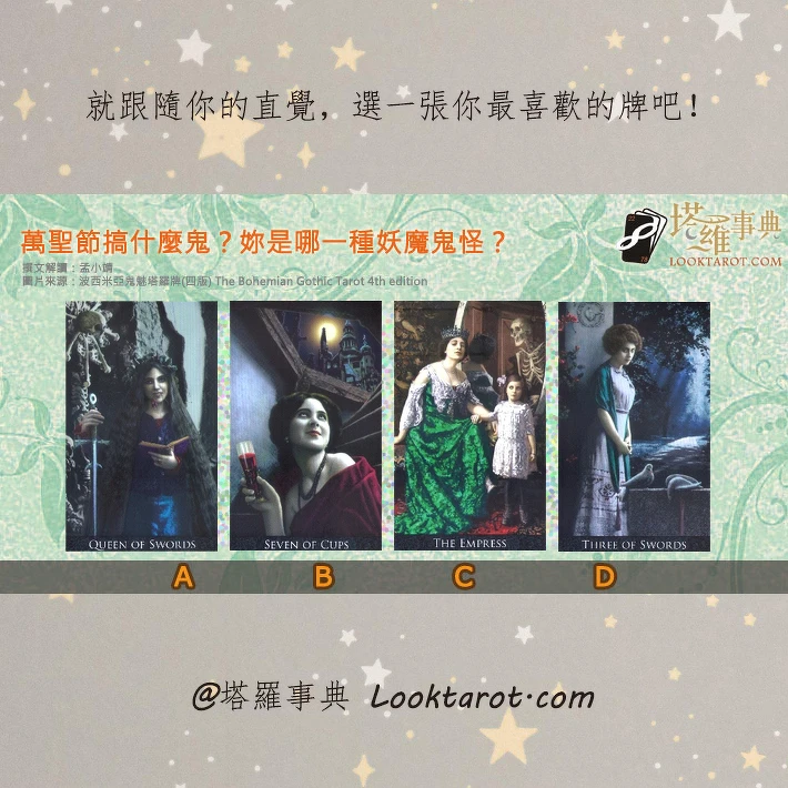 但是,在你的內心,藏著那種類型鬼怪的影子呢?在別人的眼中,你又像是哪一種妖魔鬼怪呢?快來玩孟小靖老師得塔羅占卜,現在就跟隨妳的直覺,請依照妳的第一印象,選一張妳最喜歡的塔羅牌吧!